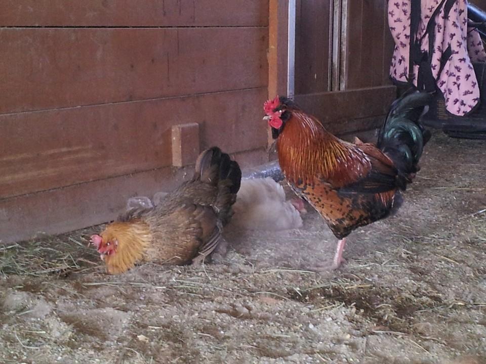 Then Roopenn was all protecting his girls and looking out for their nutrition and general wellbeing so he was looking for bugs or anything to calm his girls down ... Finally he suggested a dust bath in the barn and that really soothed them.