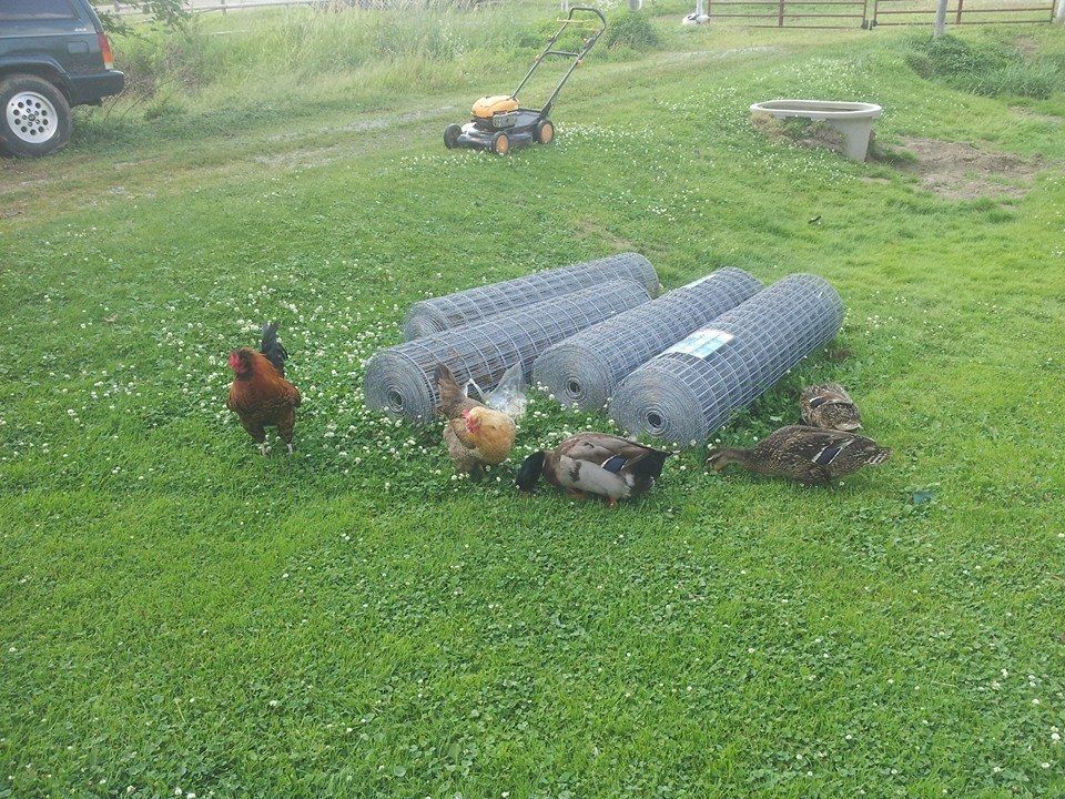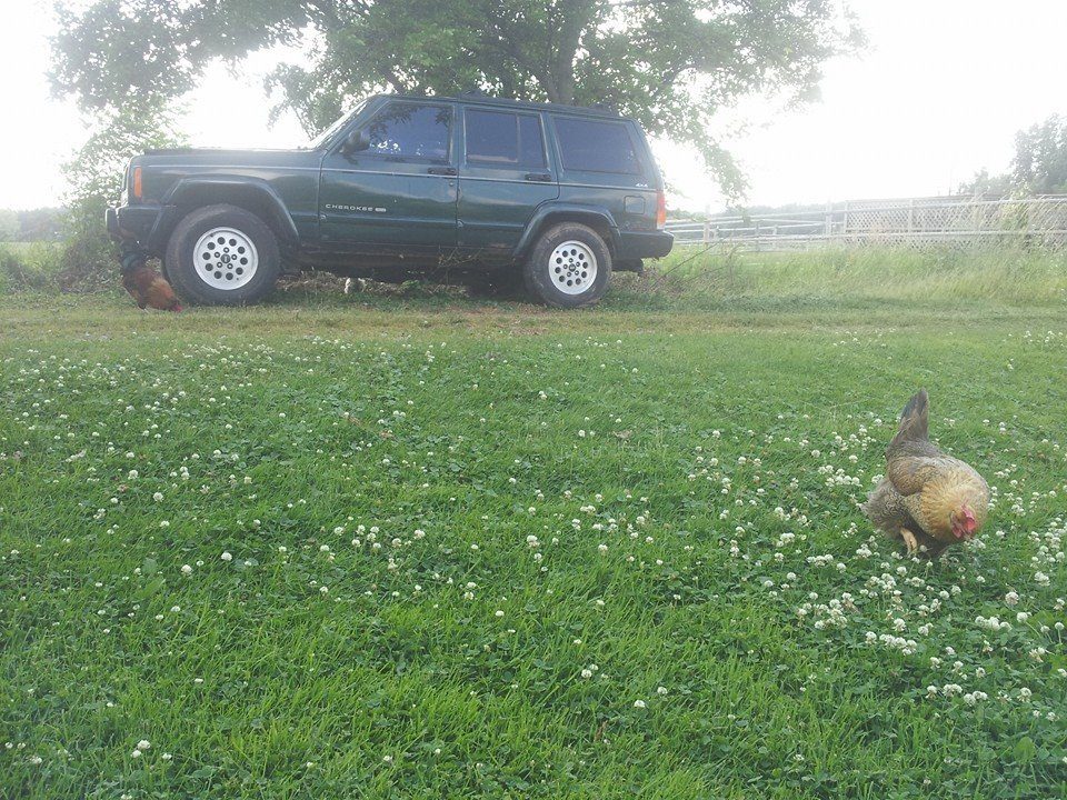 Anyways, I've never actually seen a rooster do a double take until that moment, but what's great is I think I captured it on film! Here we are. This is the situation here. Roopenn was sussing out the jeep as a potential get away vehicle while the rest of the flock examined the future prison walls for flaws. Lindsay was picking her way to help with the fence detail looking lovely as usual ...