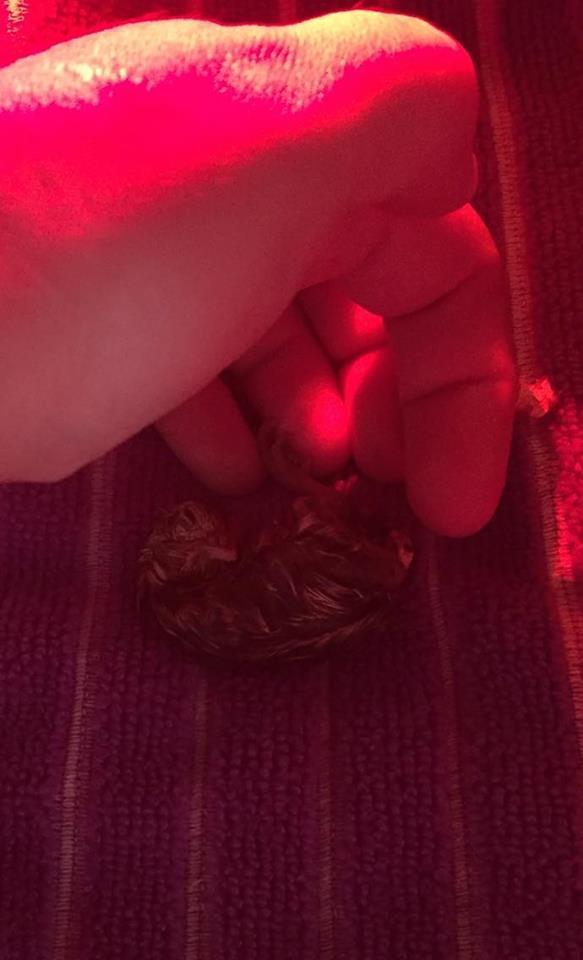 I had to intervene, as there was a string of "something" around it's neck, so i poked through the zip hole and pulled it off so he could get out. Very active already, rolling around and chirping :D Fingers corssed all goes well from here :D