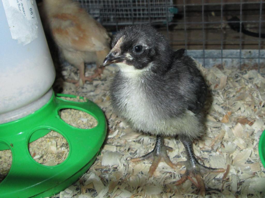 2 weeks old (mostly black australorps looks like a boy to me already, comb is large compared to the others)