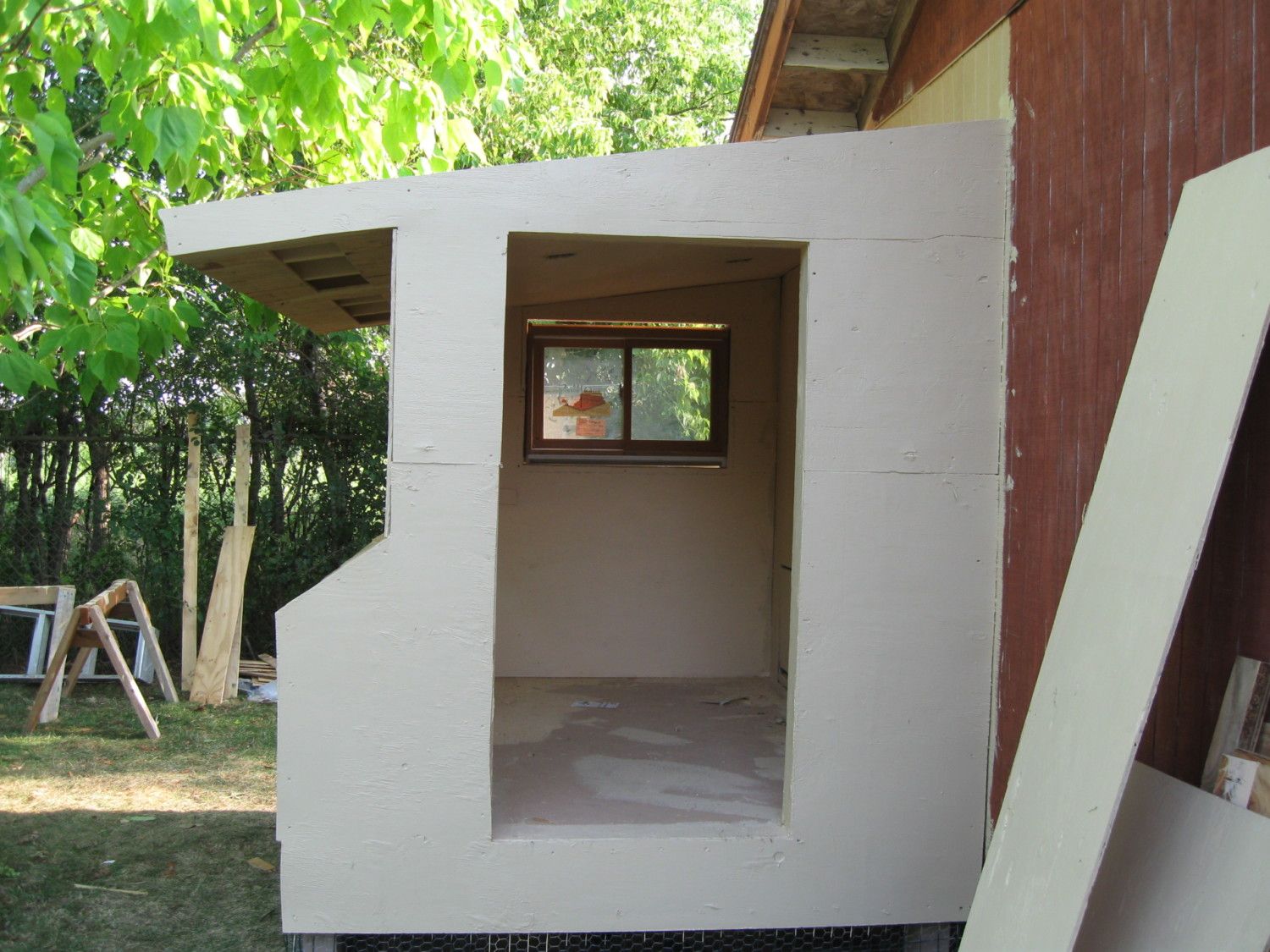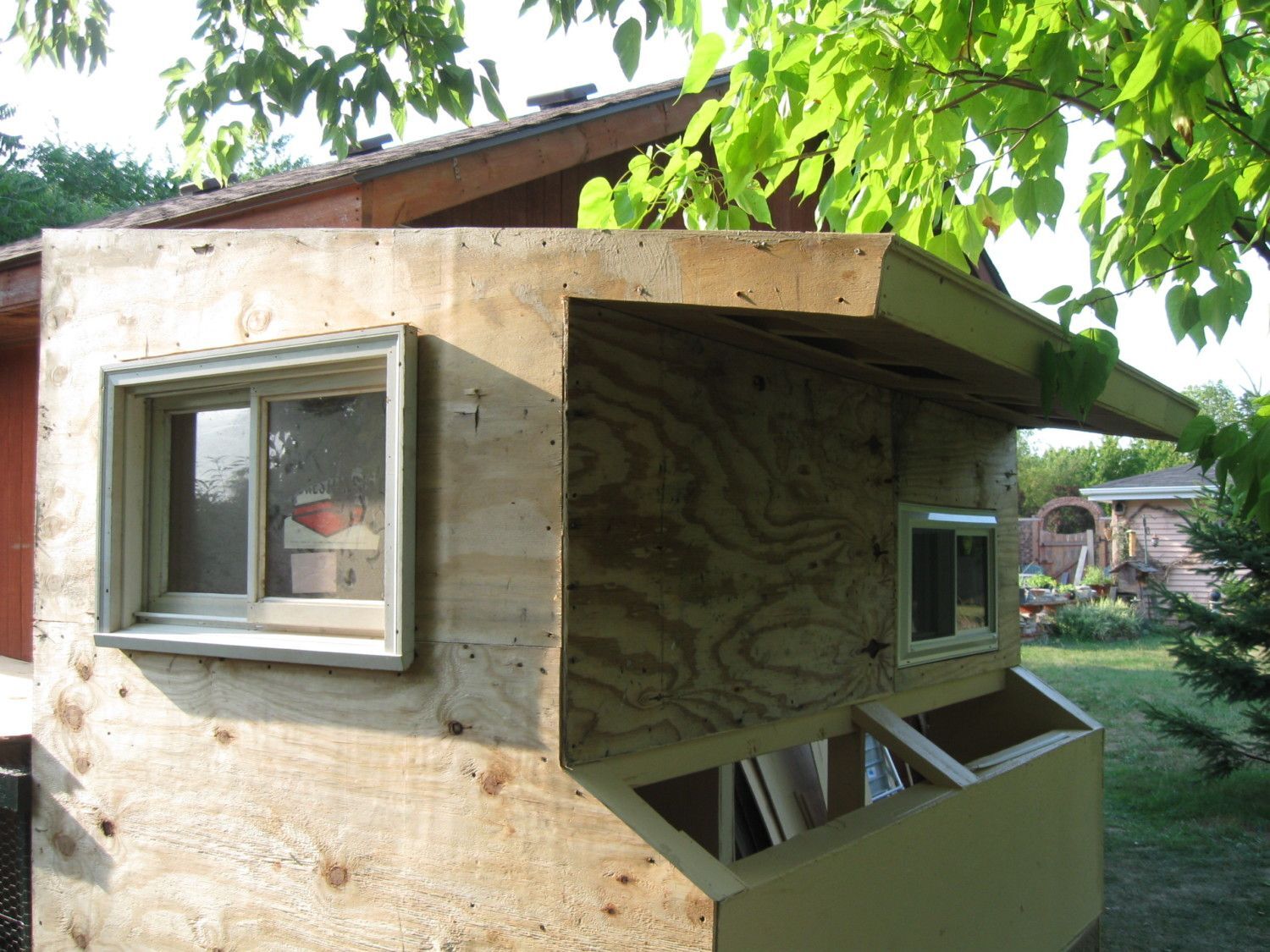 I will put trim around both windows to hold in place the 1/4 inch grid wire. But I also have to build the doors for the nesting box openings? Any ideas? I was thinking ply with a hinge . . do I make a little area that is raised on the bottom of the door - - - that fits into the openings?
