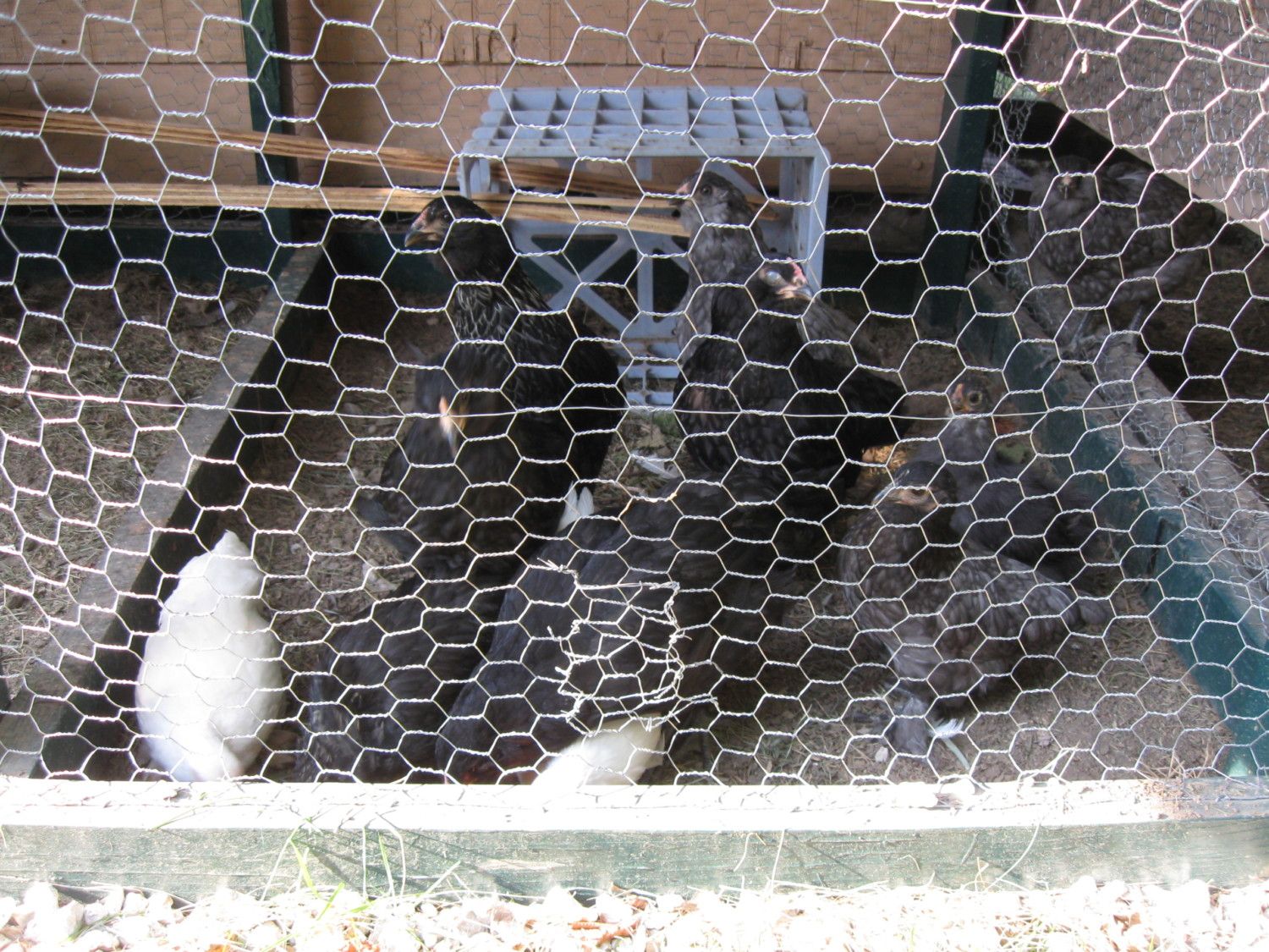 Here are the chicks. . . I don't even know what I have? I think 2 Easter Eggers and a fuzzy one? It is bad picture of them. Some are twice the size of the others. . . the black ones. . . but they all started out the same size. I have two roosters. . . and maybe a third one that challenge each other once in a while. . . do I need to separate them? ? ? Or do I have to find a new home for some of the roosters? Or will they play nice?