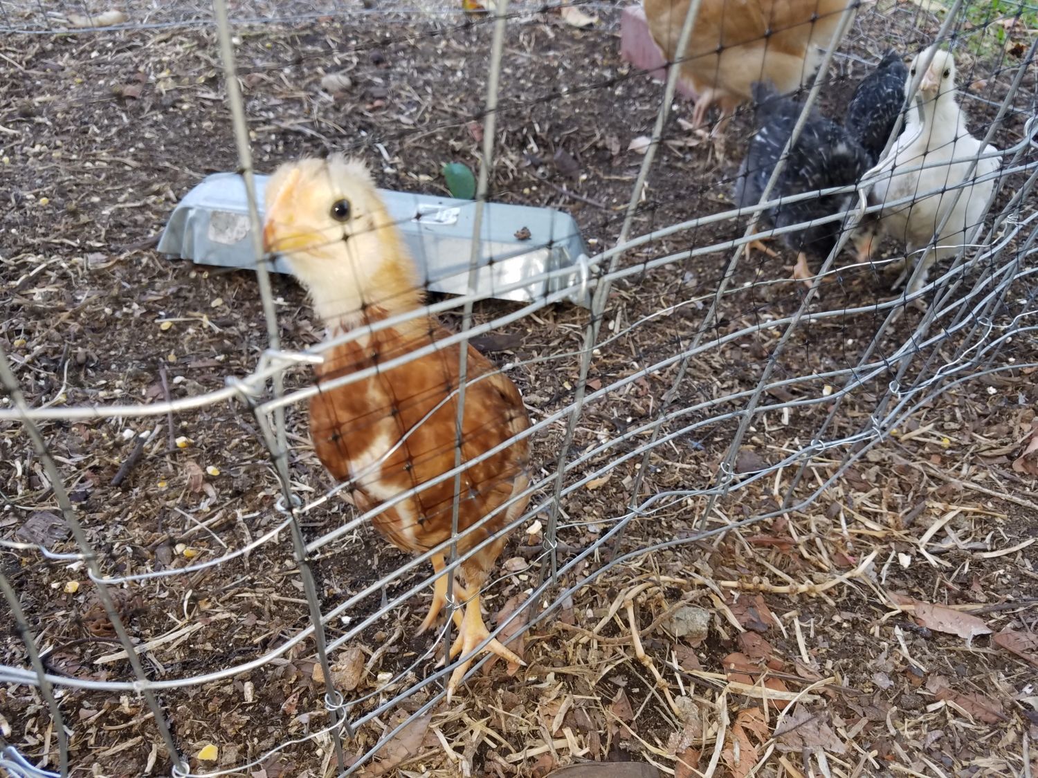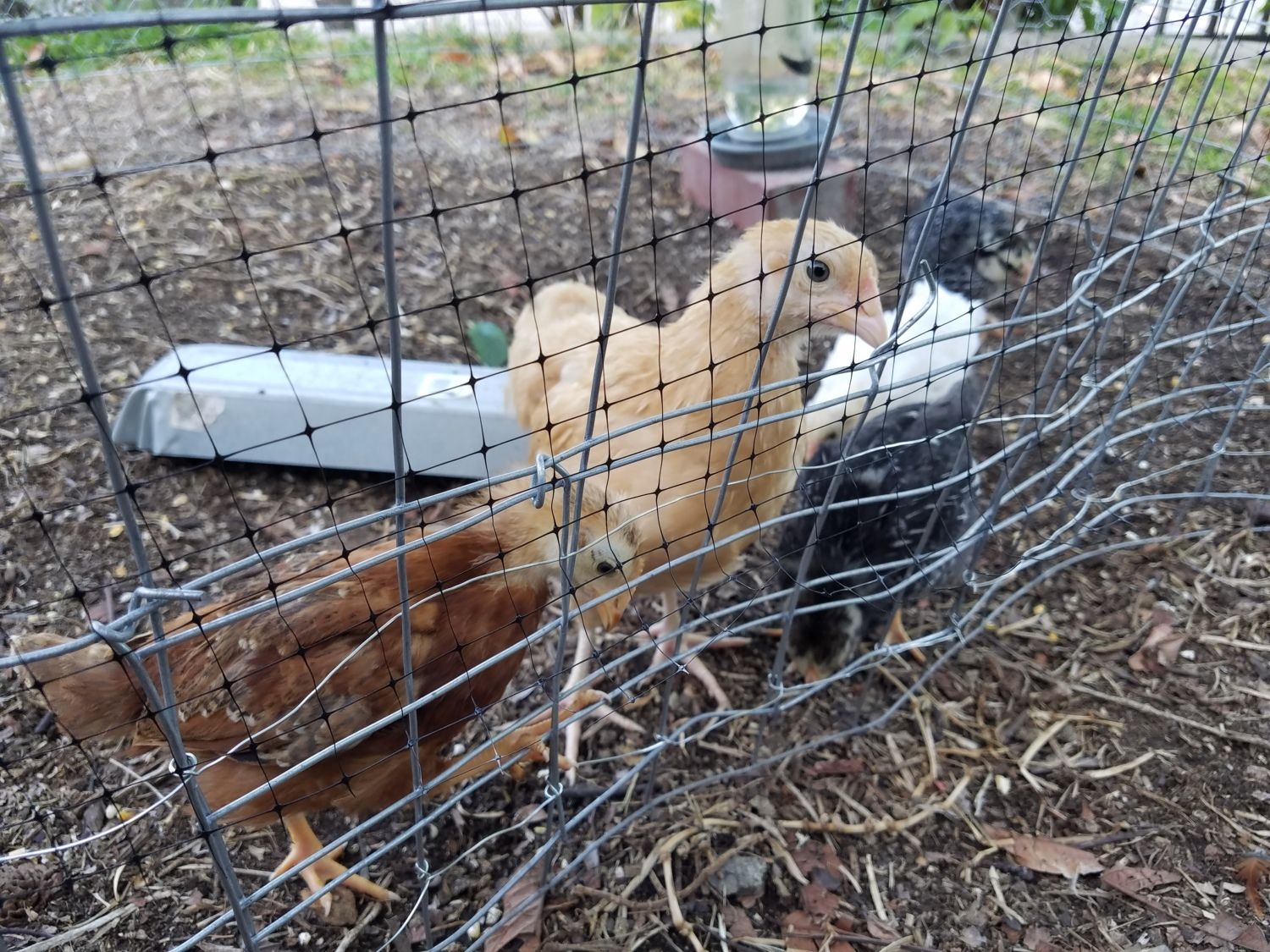 My 6 week old BO Flora, 2 - 4 week SLWs Kintsugi and Badger and my unknown bantam Wilson