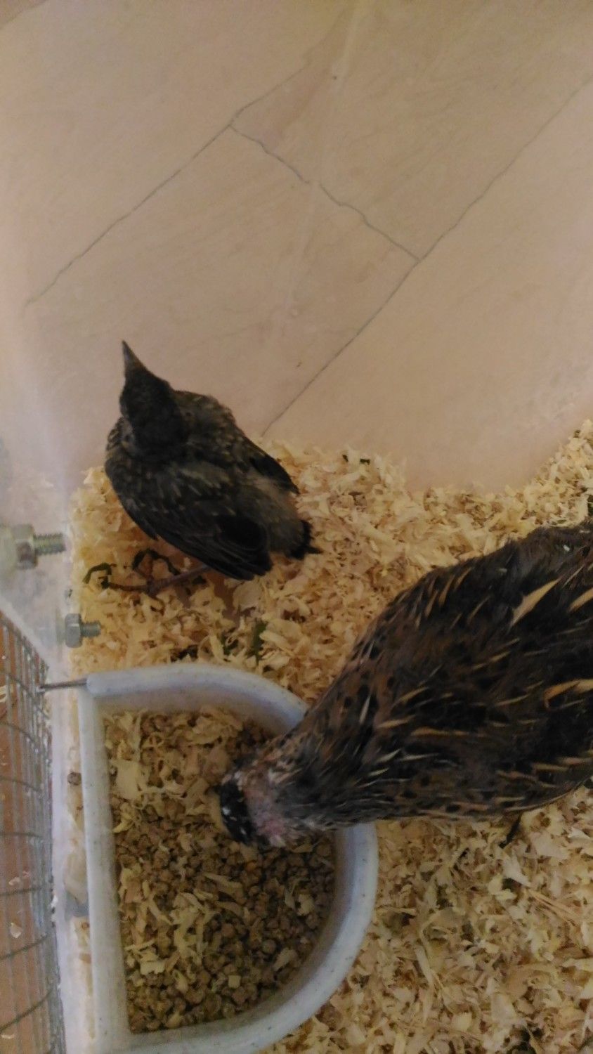 So I come home, first thing as usual I go to check on my birds, I get the eggs, check water, and I hear something chirping by the quail cage, a baby ROBIN!!!!!!!!!!!!! so I grab it and take it home from the 34C we are having today. It doesn't fly, just jumps maybe 5-6 inches. I put it in the cage inside along with my quail that was massacred two weeks ago and they are getting along fine.