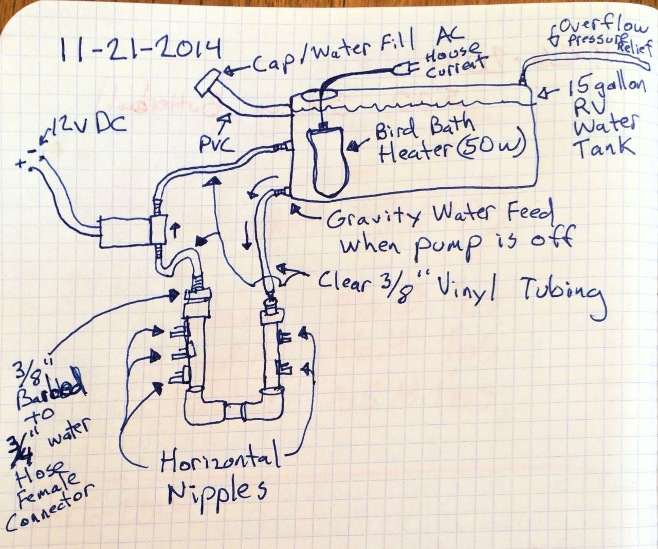 Here's the system I came up with last year to provide water for my chickens. I wanted something that would provide clean water to them for several weeks. The trickiest part is that I had to keep it from freezing solid during the winter. Here is a sketch of what I came up with.