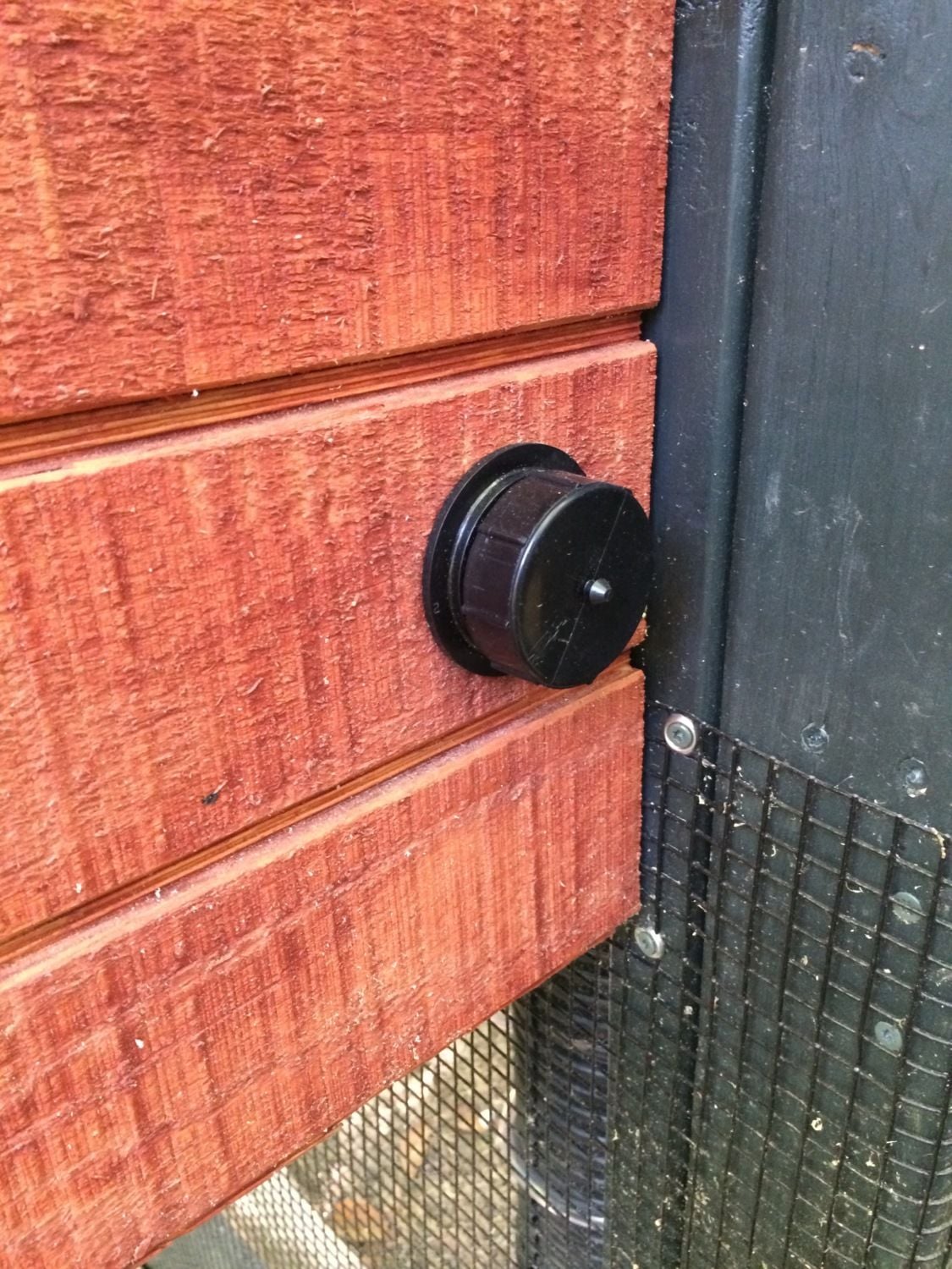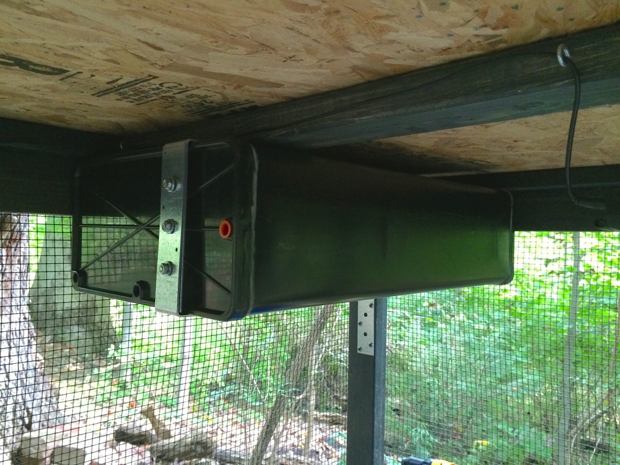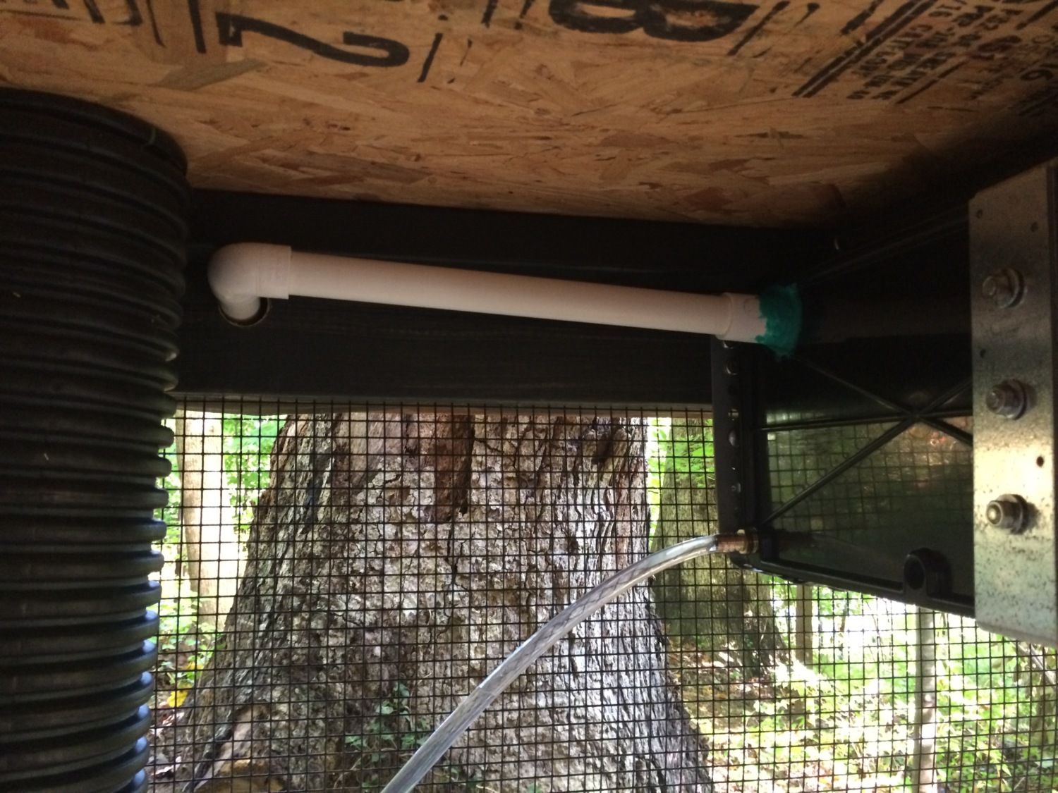 This shows the PVC pipe for filling the tank and the clear vinyl tubing that supplies water to the chicken nipples.