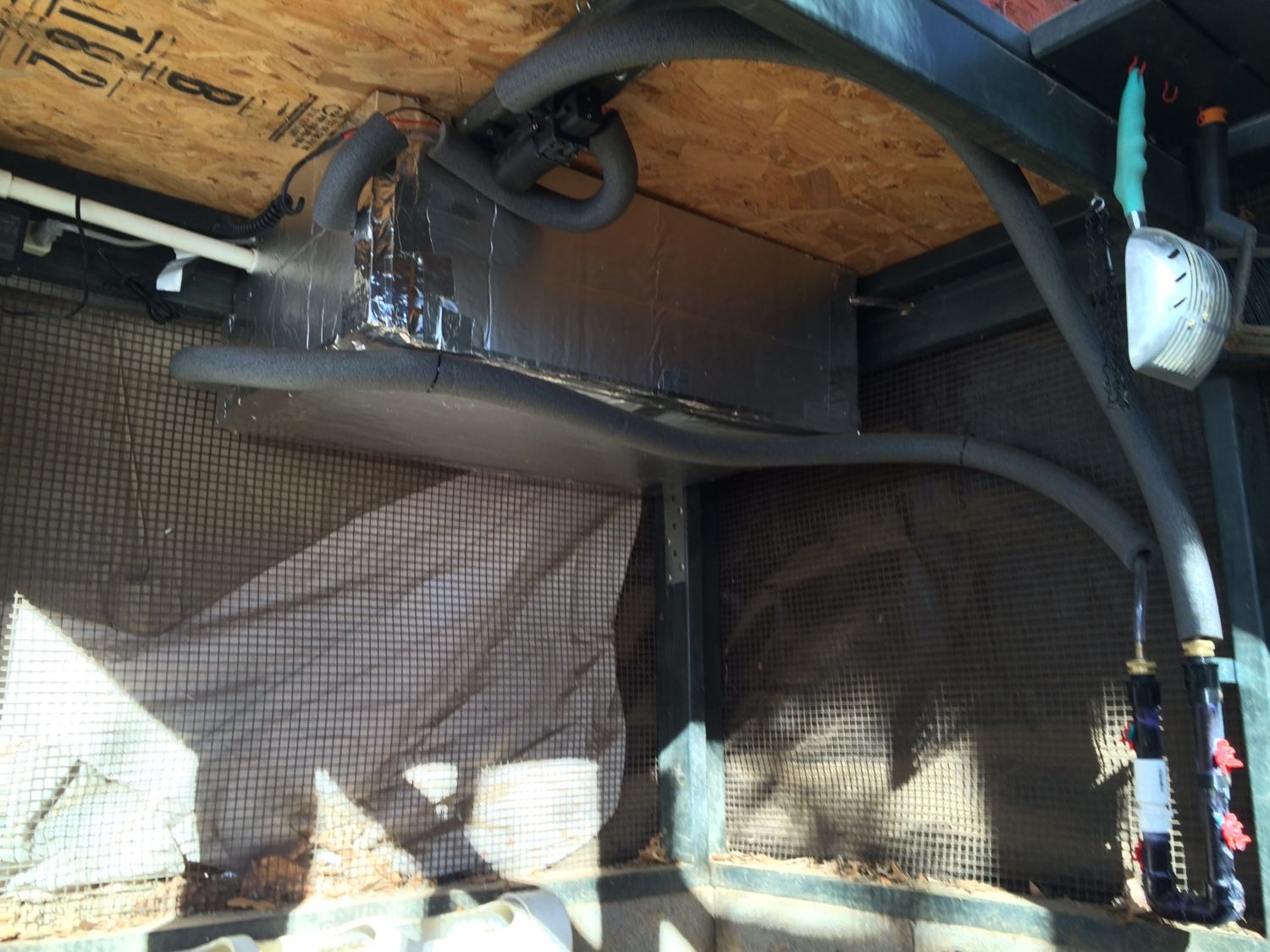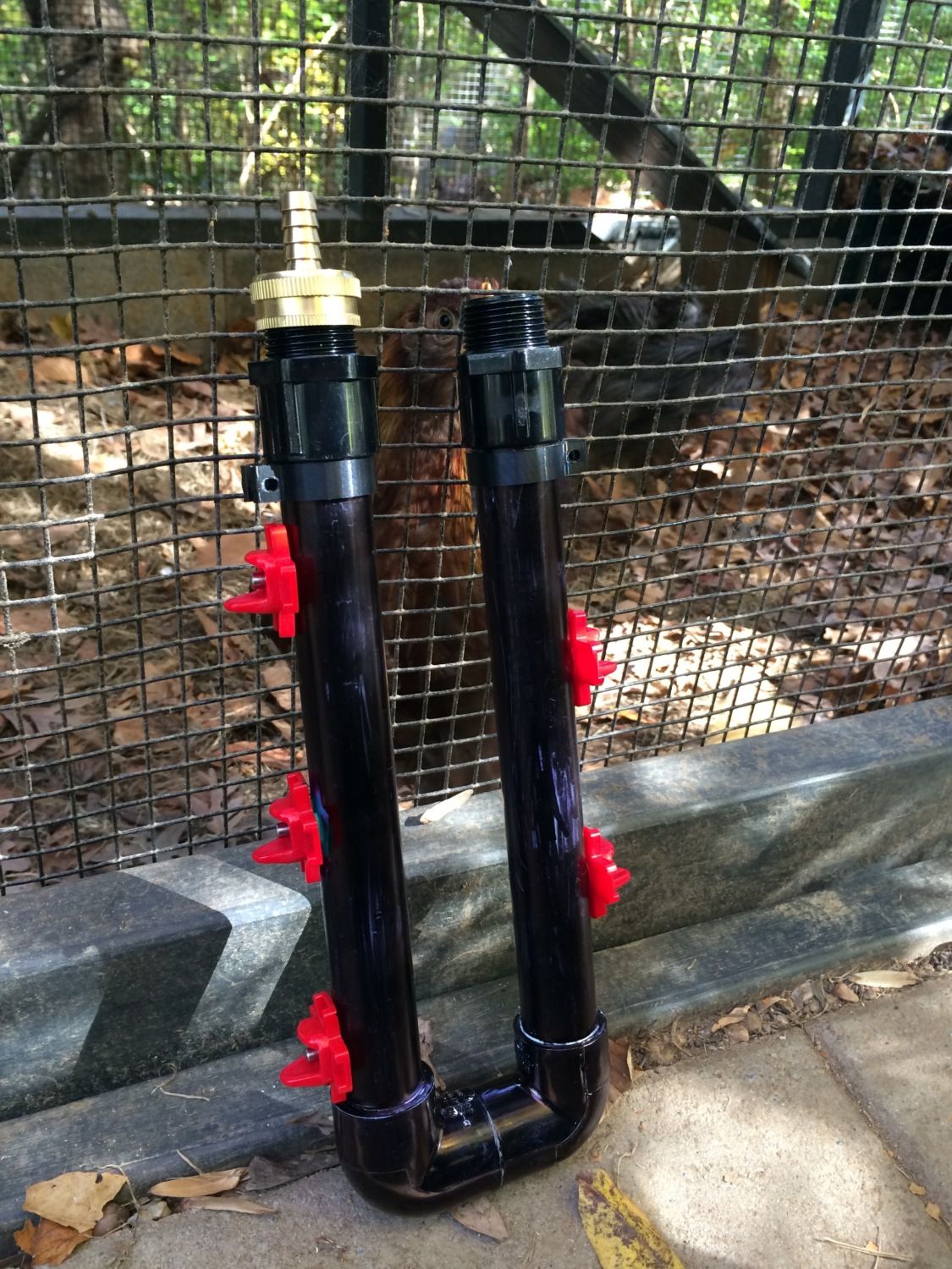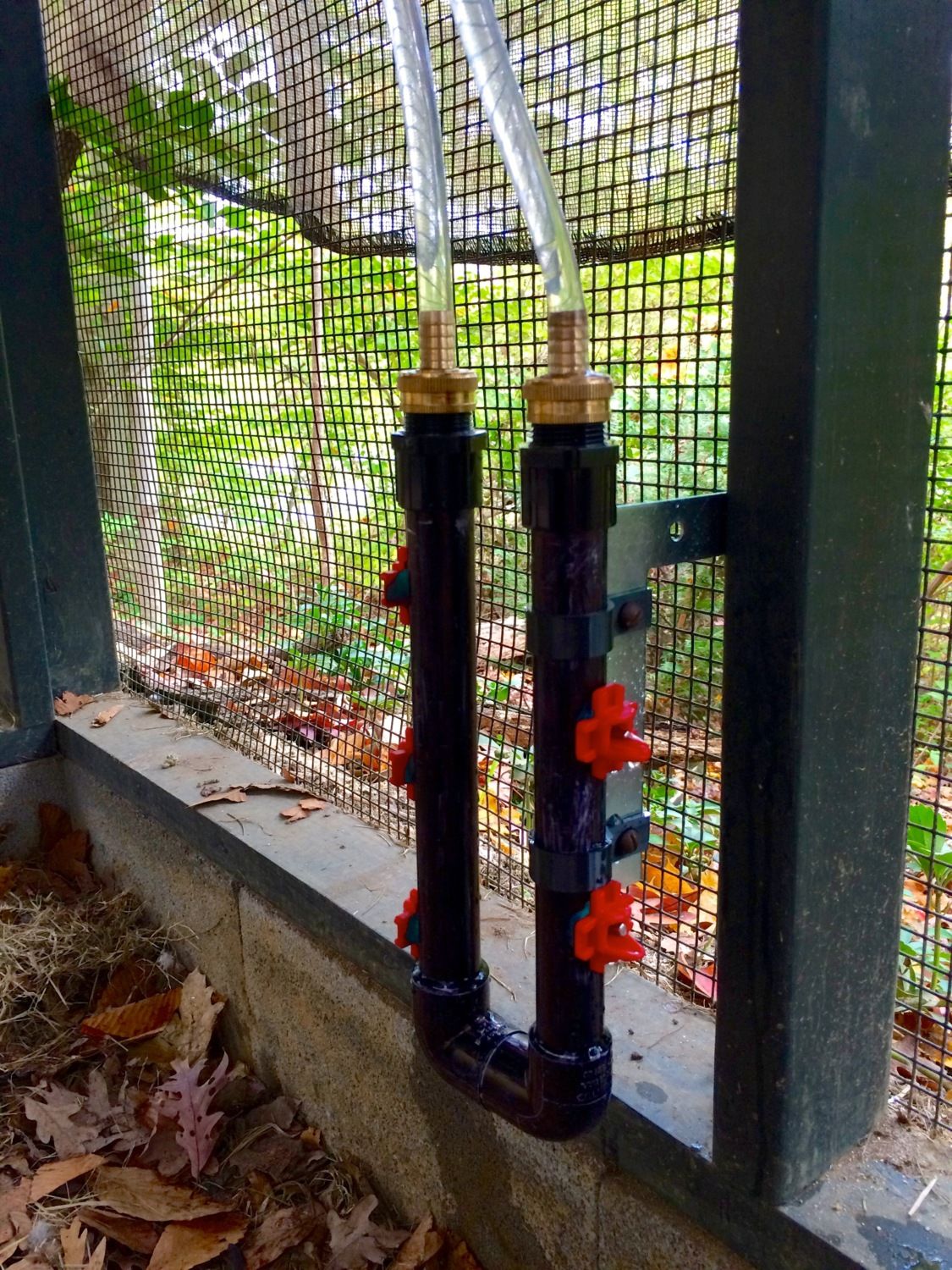 During the warm months, the pump does not run and the water is gravity fed from the bottom of the tank into some PVC piping with horizontal nipples.
