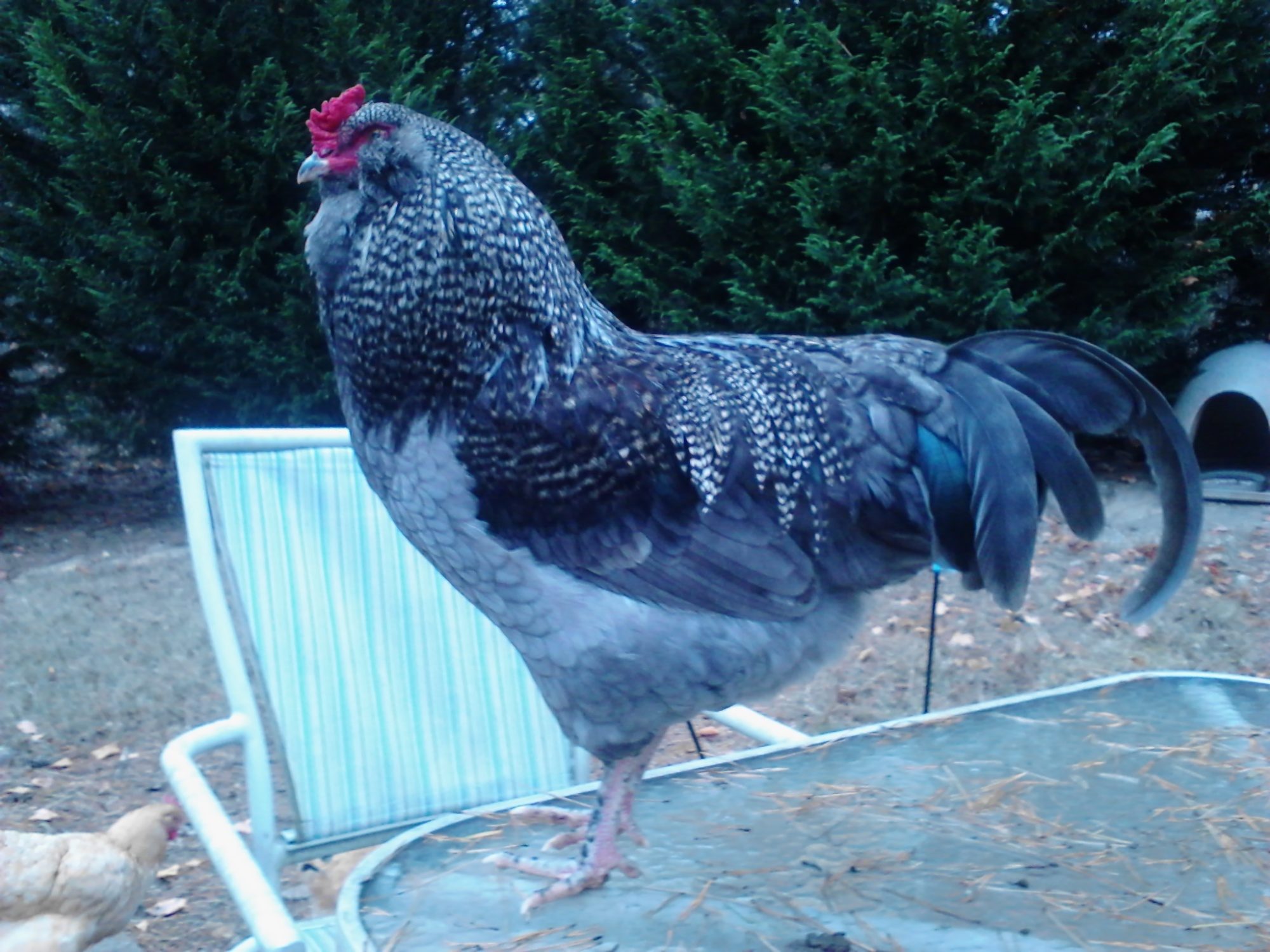 How about an olive egger? Ameraucana or Easter egger mixed with cuckoo Marans....I think that could fit. Cuckoos often don't have heavily feathered legs, if the ee/amer parent was maybe splash would explain the blue color.
