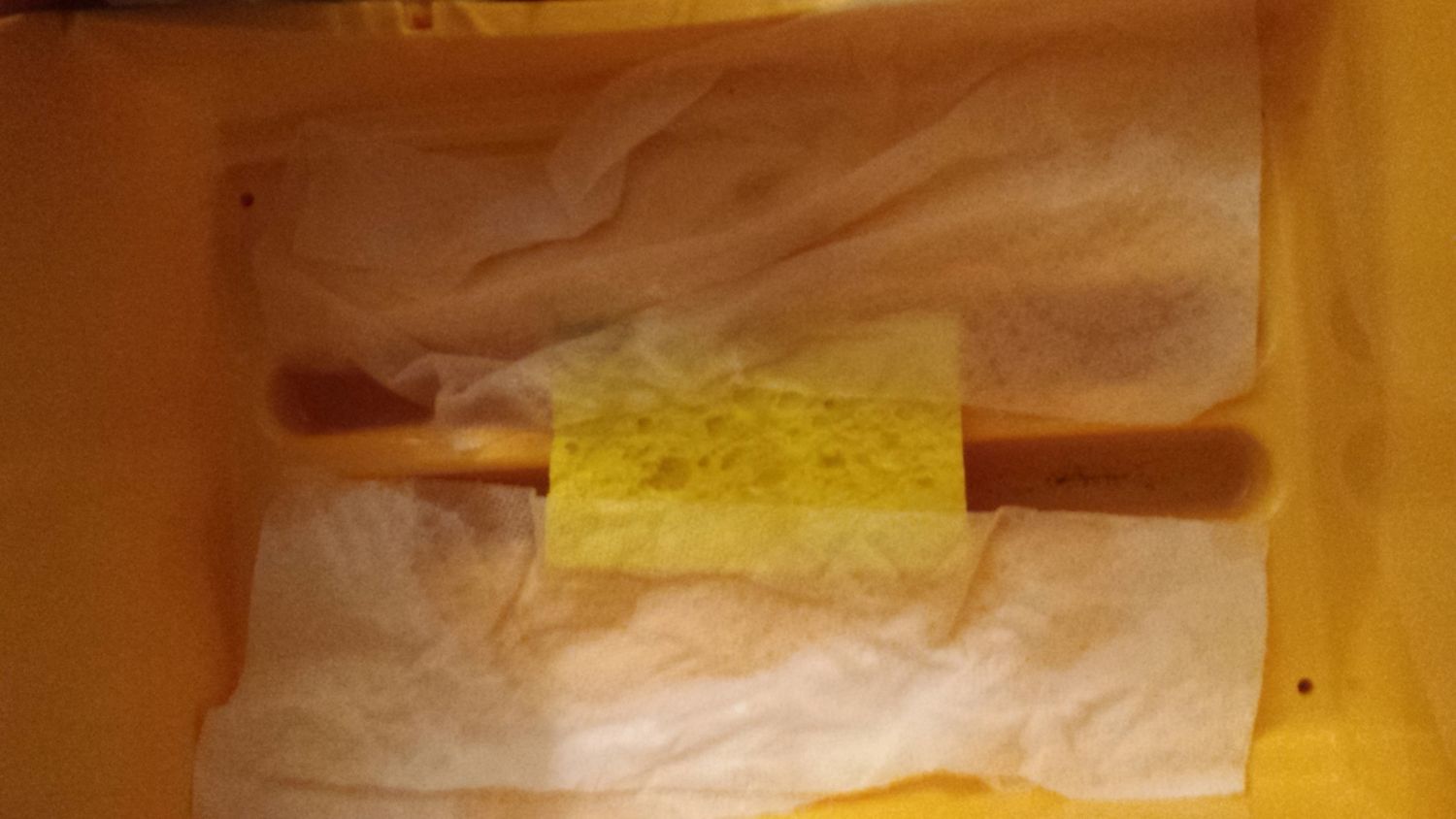 Bottom of incubatir now has both chambers filled with water. 2 sets of doubled paper towels on each side with a sponge in the middle.
