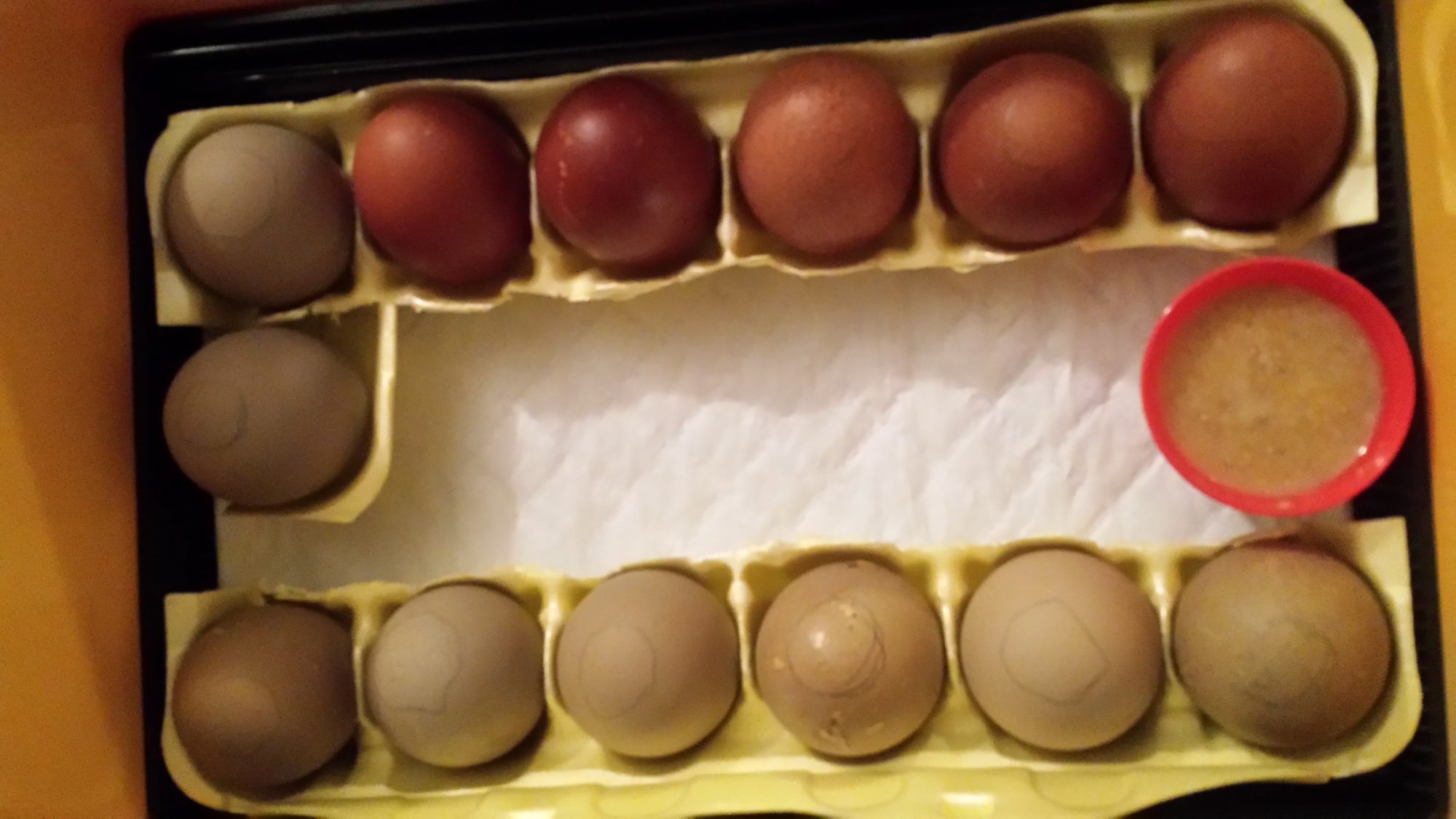 Set the eggs back in (like they were) with air cells up in the egg cartons, racks removed,a tiny 2 oz red cup of just started fermented food and the humidity/temp. Gauge.