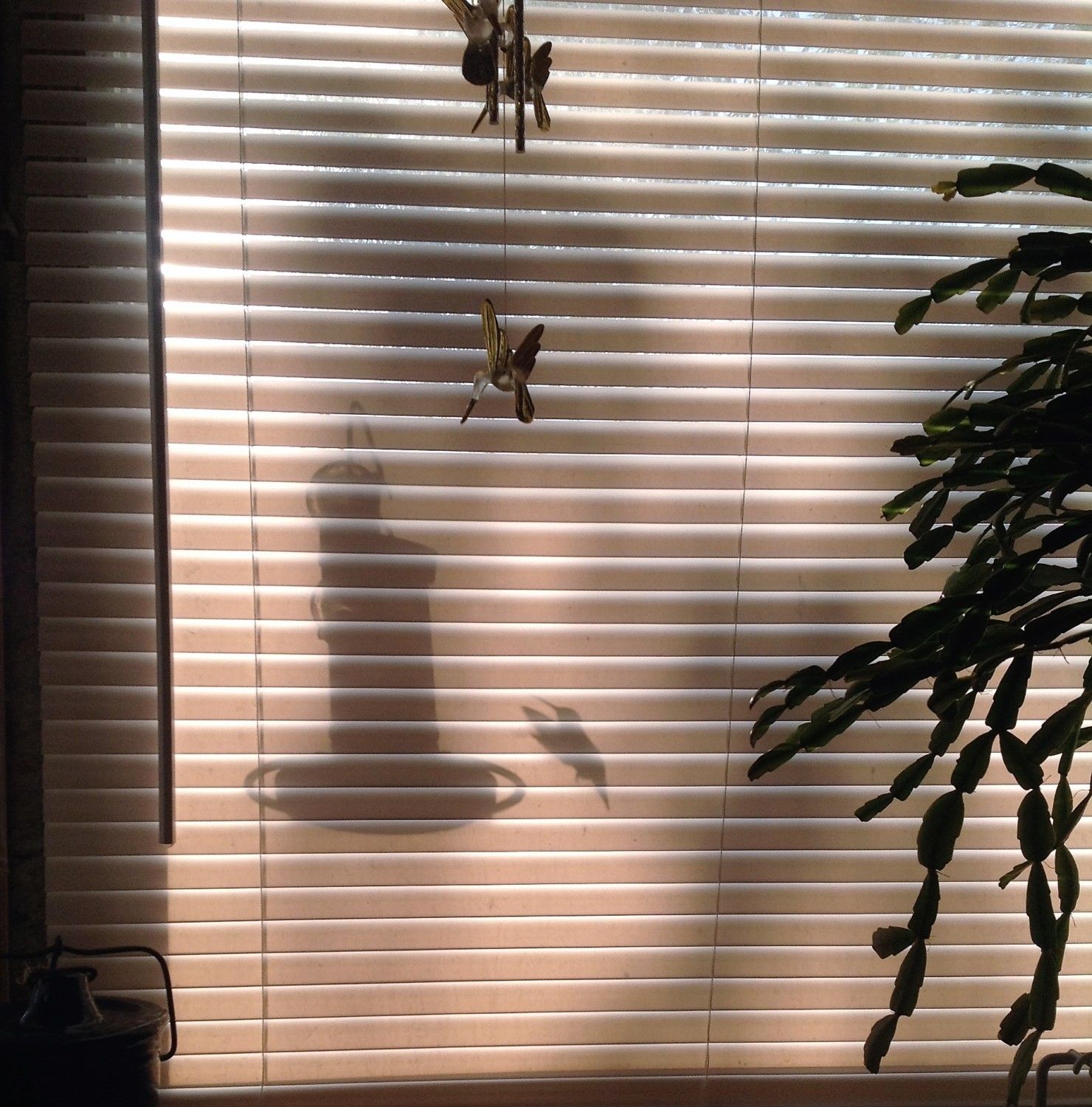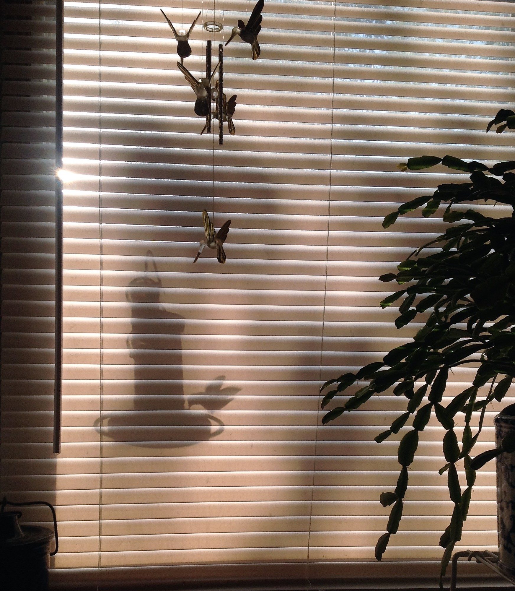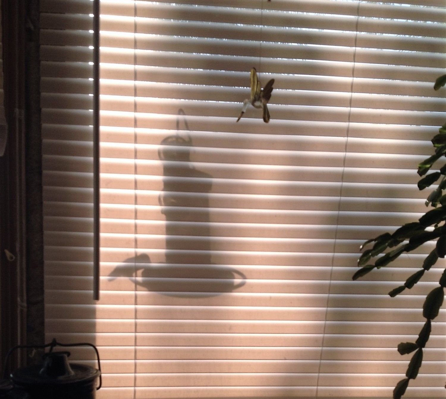 Good morning! You know, I've been thinking......could you tell? It's been a long, long time since I shared a hummingbird picture on here, and I didn't have as many hummers last year as I have in years past. They kinda wax and wane from year to year. And it seems like I was never set up when they did come. But I did get some last year that tickled the stuffin' outta me, and I never posted them for some dumb reason. I was just sitting at the table, blinds closed so the morning sun wouldn't glare on the computer screen, when I caught movement out of the corner of my eye, right on the feeder just outside the window under a blown glass hummingbird mobile Katie got me one year. If I'd opened the blinds he would have been gone. If I'd tried to take it with the blinds open the sun would have been too bright shining right into the camera. It was either grab the iPhone and shoot or miss it completely. So Rachel, I was thinking - maybe I didn't post them before because you didn't need them then. Maybe the lesson here is sometimes waiting for everything to fall into place perfectly is overrated, and we just have to accept less at times in order to really see things in a different light. And maybe I should just post the stoopid pictures and get another cup of tea. <sigh>
