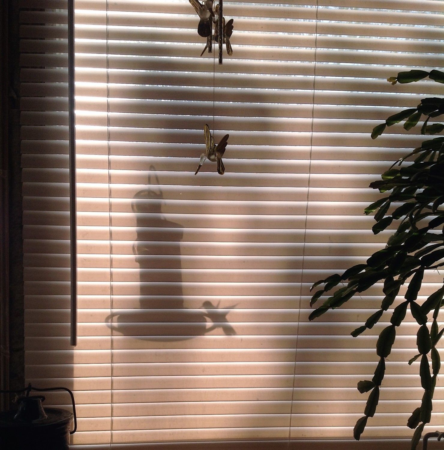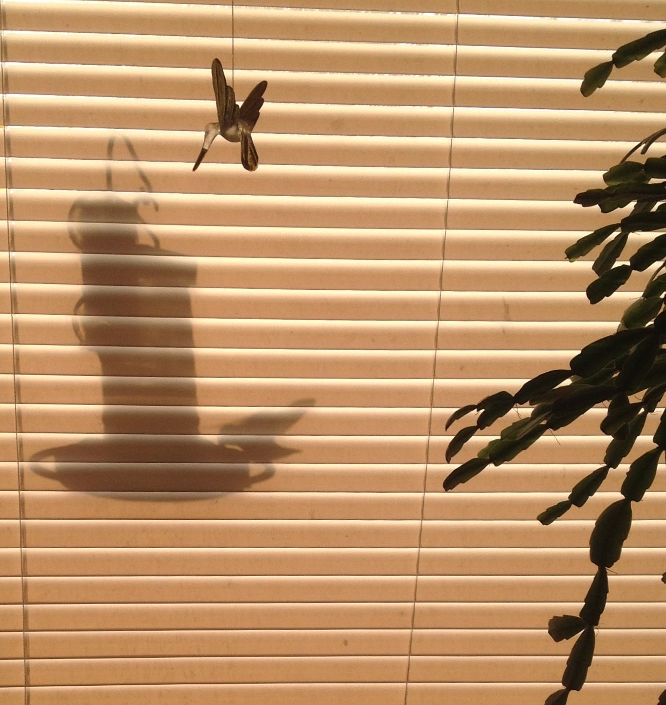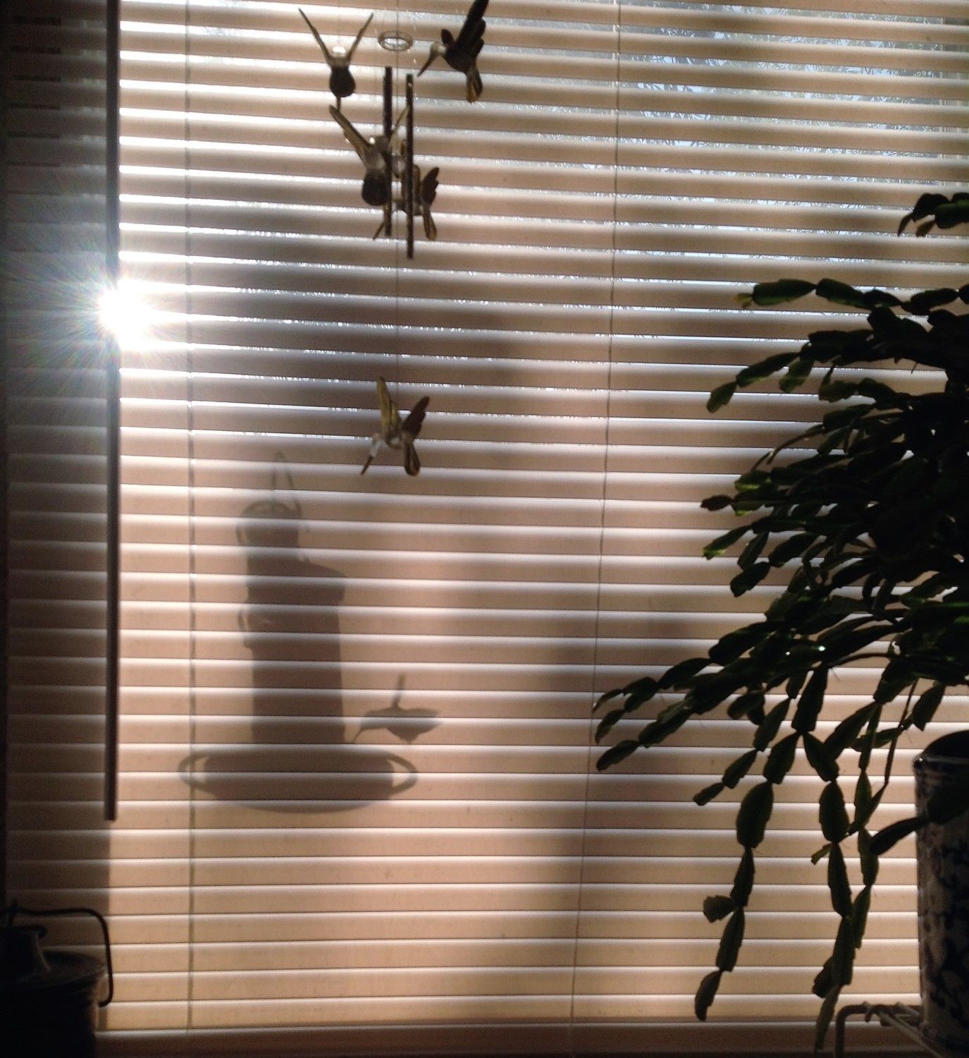 Good morning! You know, I've been thinking......could you tell? It's been a long, long time since I shared a hummingbird picture on here, and I didn't have as many hummers last year as I have in years past. They kinda wax and wane from year to year. And it seems like I was never set up when they did come. But I did get some last year that tickled the stuffin' outta me, and I never posted them for some dumb reason. I was just sitting at the table, blinds closed so the morning sun wouldn't glare on the computer screen, when I caught movement out of the corner of my eye, right on the feeder just outside the window under a blown glass hummingbird mobile Katie got me one year. If I'd opened the blinds he would have been gone. If I'd tried to take it with the blinds open the sun would have been too bright shining right into the camera. It was either grab the iPhone and shoot or miss it completely. So Rachel, I was thinking - maybe I didn't post them before because you didn't need them then. Maybe the lesson here is sometimes waiting for everything to fall into place perfectly is overrated, and we just have to accept less at times in order to really see things in a different light. And maybe I should just post the stoopid pictures and get another cup of tea. <sigh>