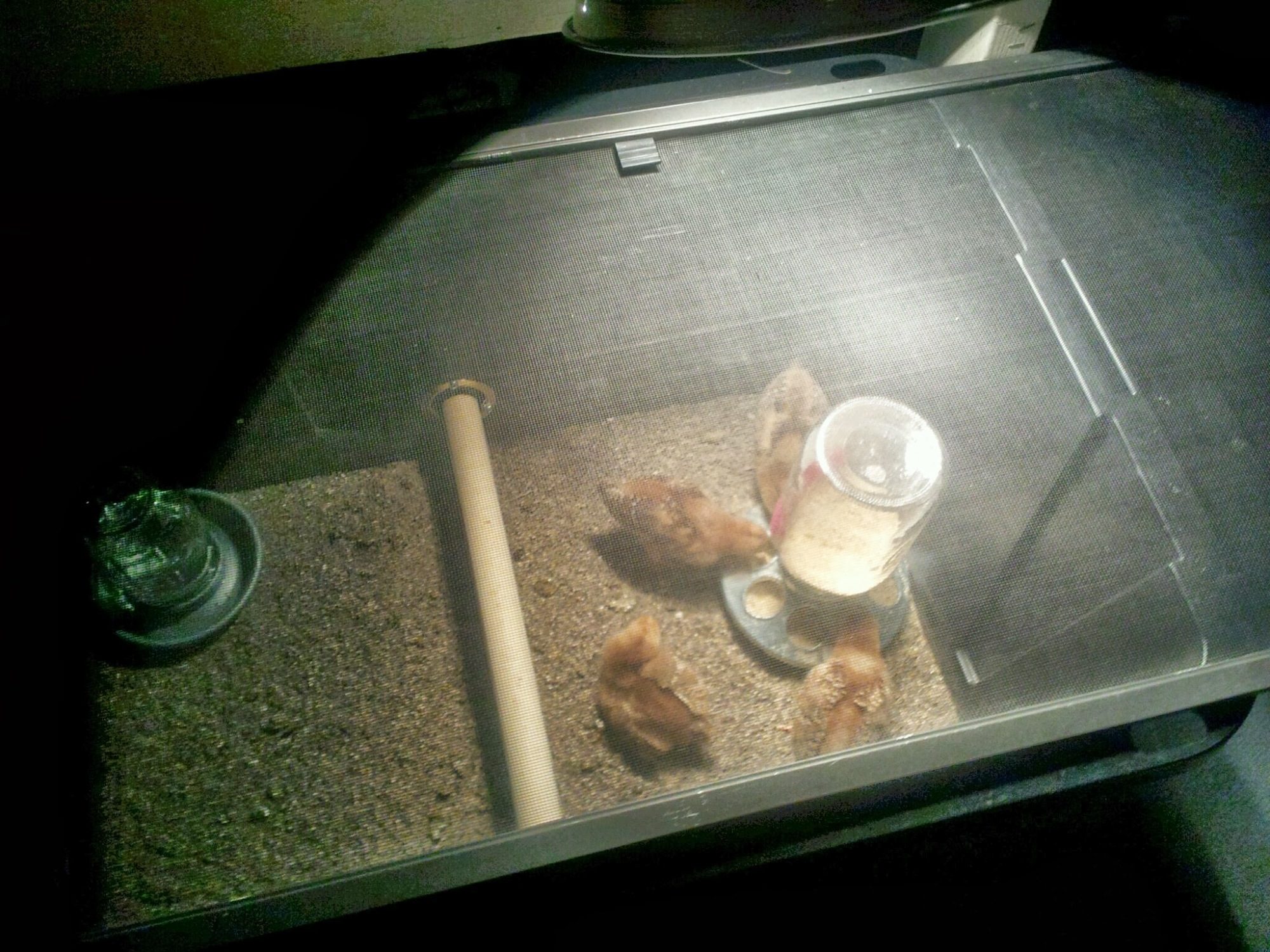 Super excited to have picked up my first chickens as an adult. I raised them as a pre-teen in 4-H. Access to live chicks is extremely limited where I live in Arizona. 4 RIR's just about 2 weeks old today. They are absolutely adorable!! I asked for bands when we were there but they don't sell them. I was like Oh Well, maybe we can tell them apart. Oh yes certainly!! They all have different coloring especially on their heads so they already have nicknames until we can name them based on personality. We brought a box with construction sand with us and placed them in there for the 3 hour ride home. We asked about food or water but were told they would be fine.