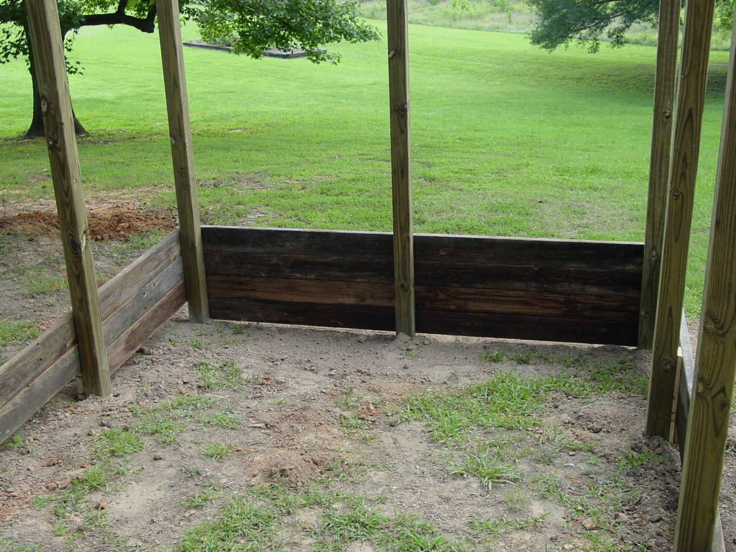 I am working alone for a day or two, and it's slow going. I began building the retainer walls in order to backfill and level the run. I plan to install a four inch diameter perforated plastic pipe along the bottom of the back wall for good drainage. Then, I can plug the remaining small openings at the bottom of the wall and fill with construction sand.
