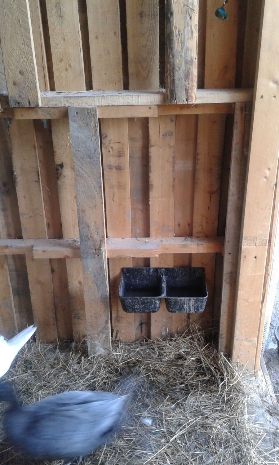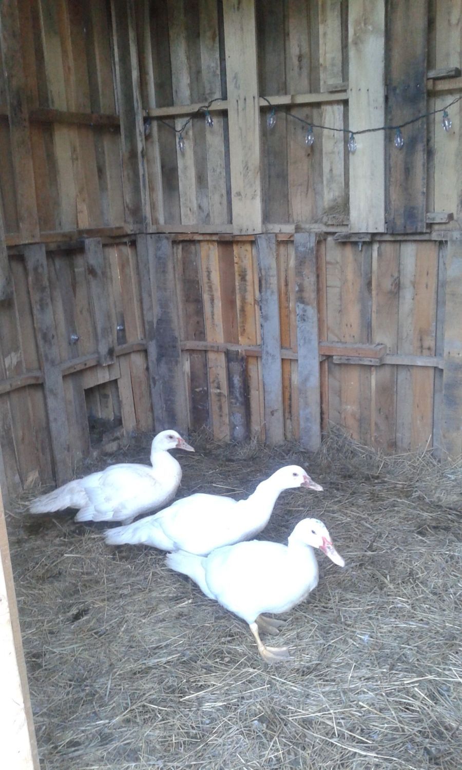 This duck house took my husband and I about a month to build. The floor is 4 pallets that currently has extra pallet boards covering the gaps but we are switching to vinyl plank (hubbs installs floors and there were a few boxes left over). The walls are two pallets high all around bolted every 4 inches or so and screws in between (hubby went overboard lol). The roof is metal. I installed a mineral feeder (normally for goats) onto the wall for water at night and has worked awesome so far. I put it high enough for the ducks to just be able to get their beaks in and there hasnt been a huge wet mess all over as I had with the bowls. I asked for nesting boxes and hubby came up with an extra awsome idea for me .. in between the two nesting boxes he added a space for me to put two bales of straw so its all in one area and I dont have to lug it down from the garage. During the winter we will be adding a door to the front to avoid snow and critters from getting into it. He made cut outs and used hardware cloth for the top front and windows on both left and right sides of the house. He reinforced the wiring on the inside by framing out the window. I love it for ease of cleaning and is much more spacious for the ducks. We are going to water seal it to prevent rotting due to the snow this winter. I think we did an amazing job and im grateful he put so much into it.
