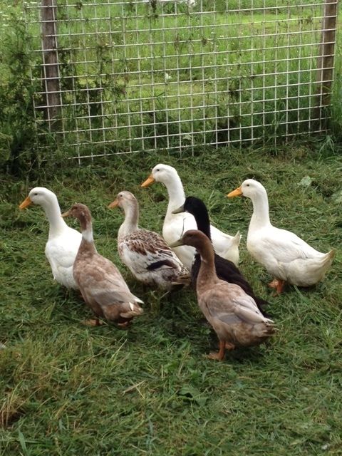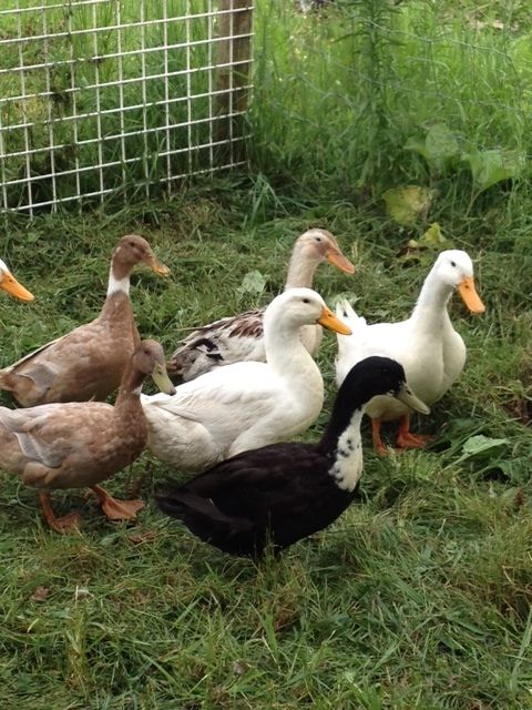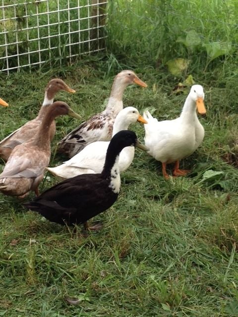 Agreed.It looks like you have three Pekins (the white ones), a black Swedish (black and white one), a Welsh Harlequin, and a Khaki Campbell. The only duck that I am not sure about is the mostly brown one with a ring of white around its neck.