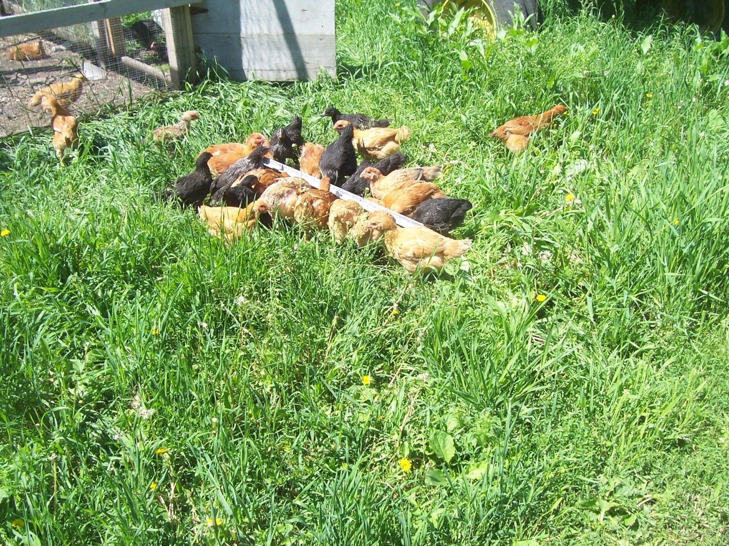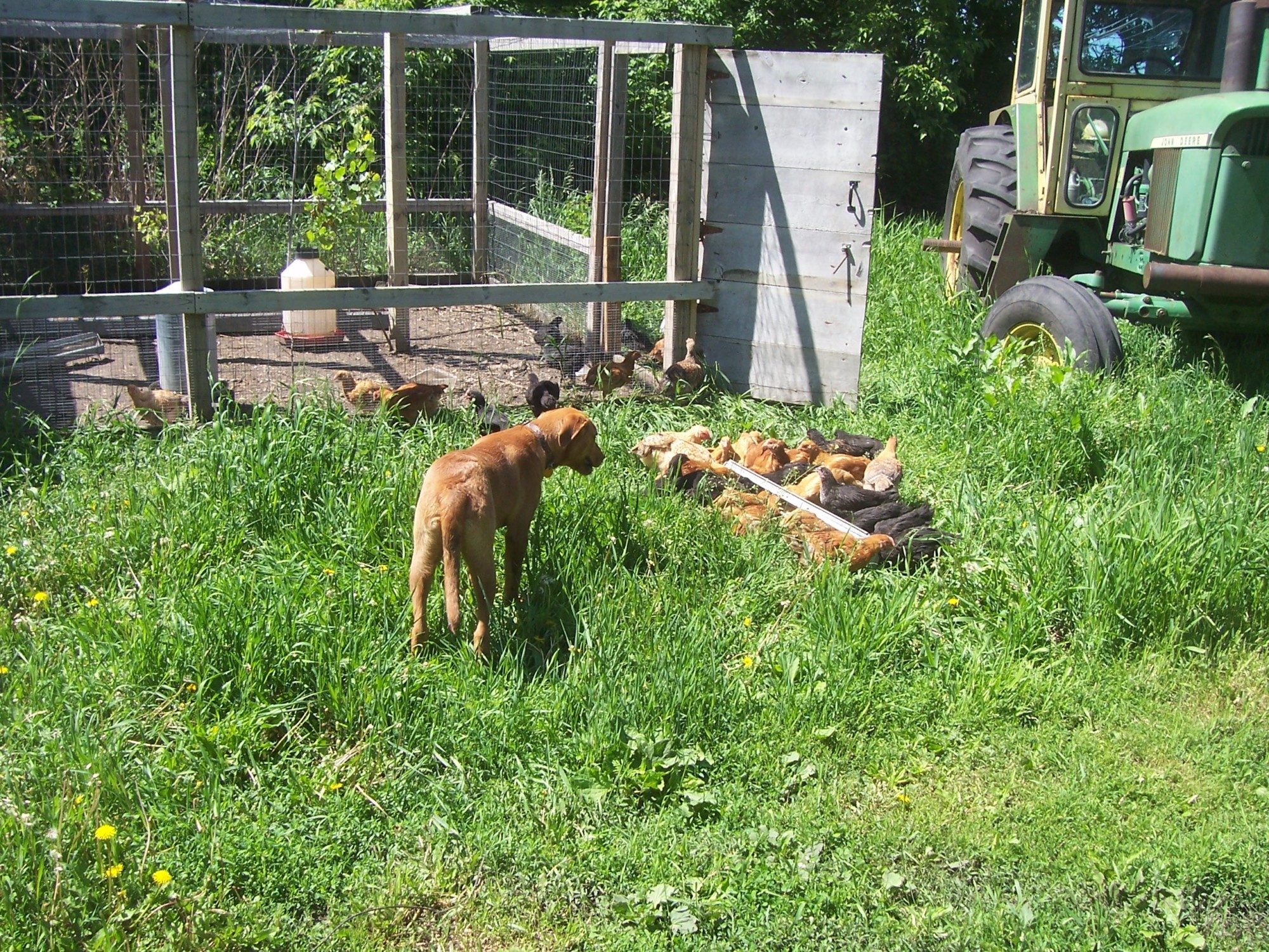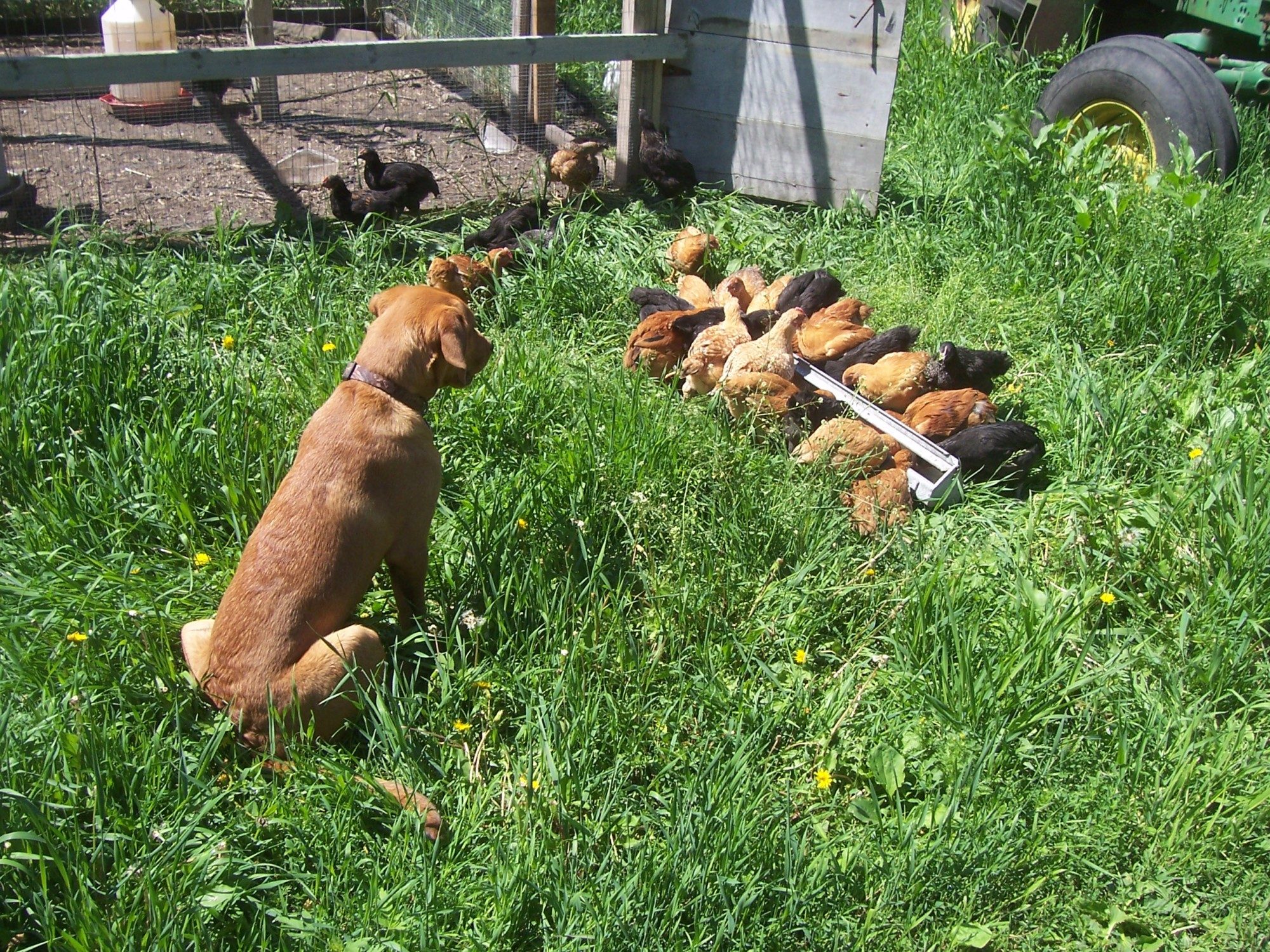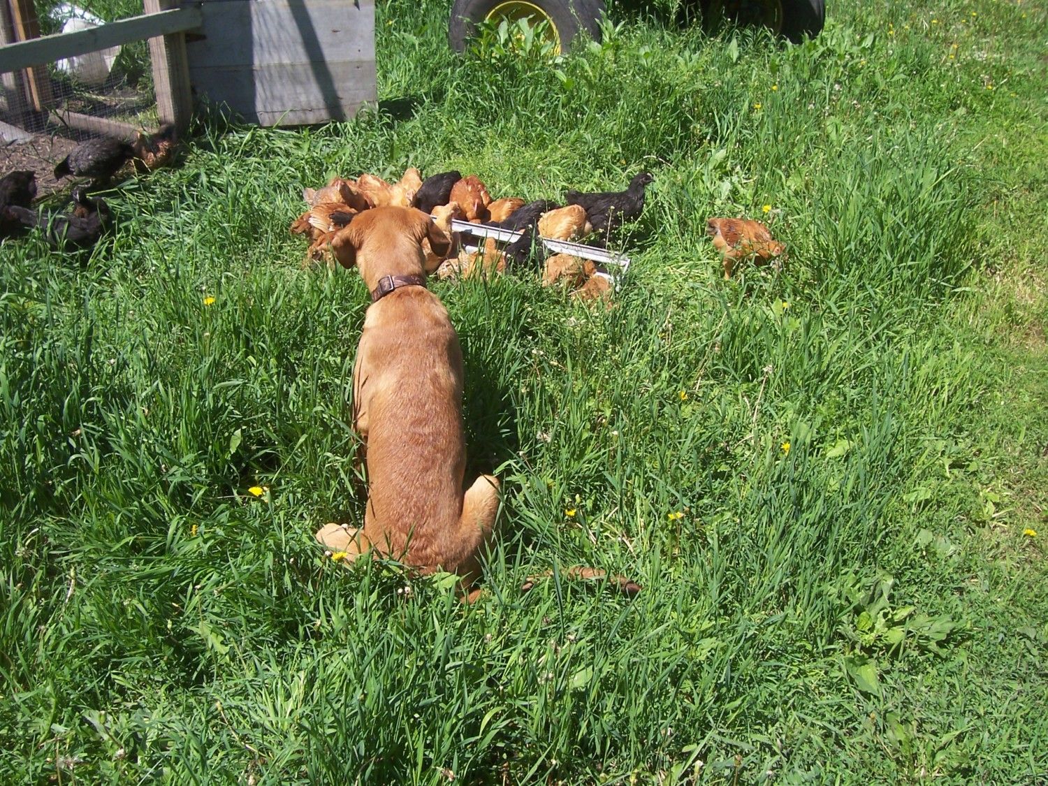 Update: Just let the Freedom Rangers out for the first time today. They are 5 1/2 weeks old, and I was a little concerned about how Ruger would react, since he has shown interest in them, looking at them through the fence. Here's what happened: