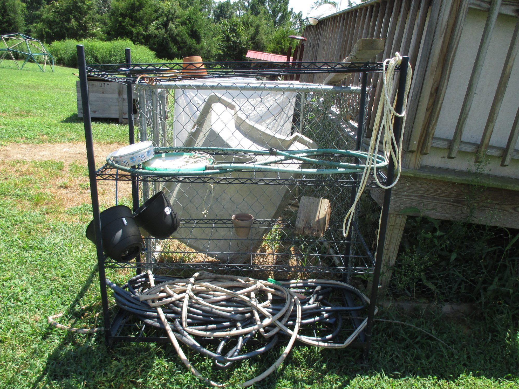 This wire shelving unit (currently not being used for anything except a place to put junk when I clean up the yard before mowing):