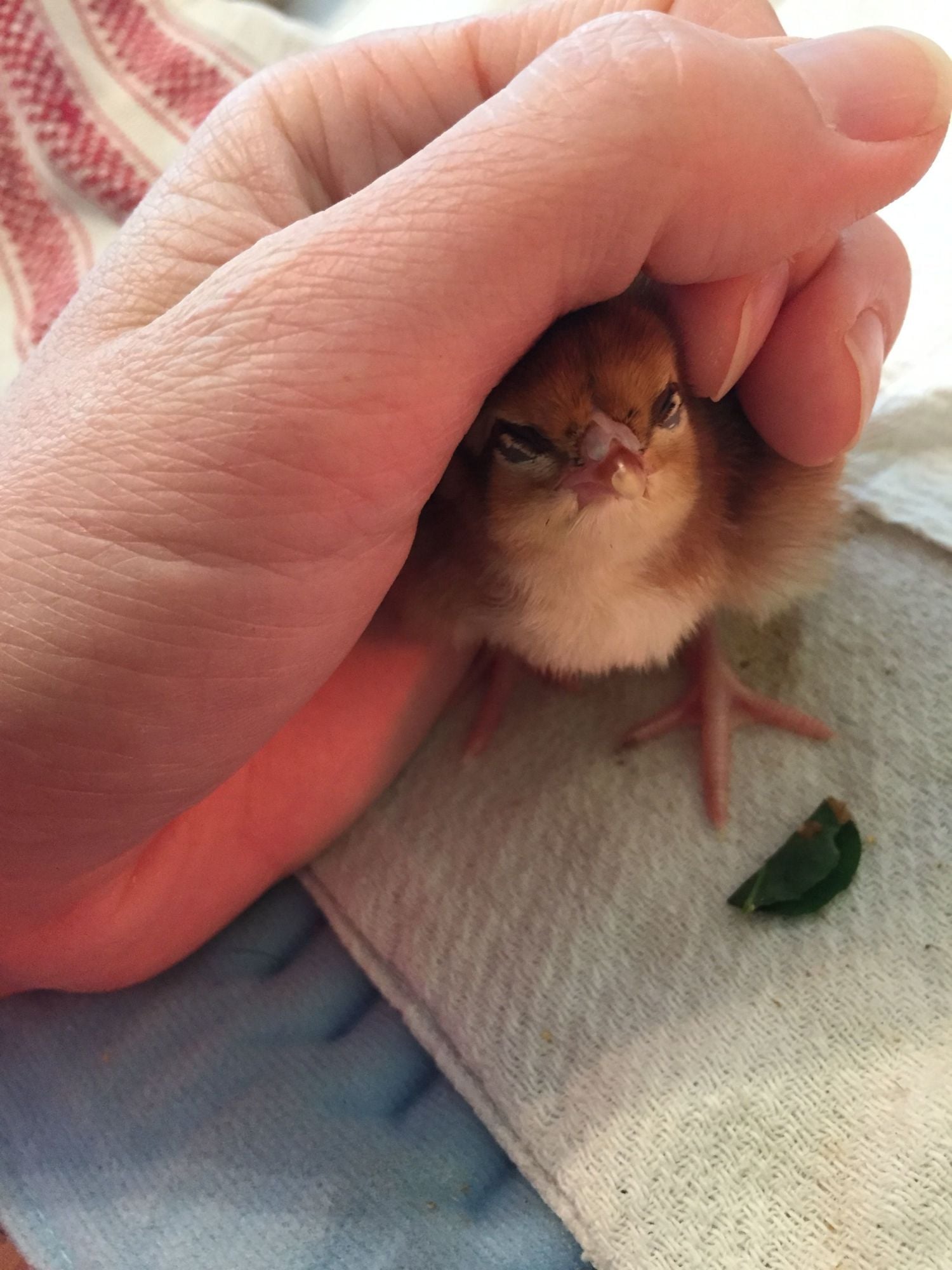 Tracking updated at 7am that they were 15 minutes away. Then an hour later that they were at the po. Got a call 15 minutes later to come get them! Sadly, a Buff Orpington and, double sadly, my Partridge Rock were DOA. One of the SpeckledSussex was so tiny, couldn't stand up, open her eyes, just lying in the bottom. We "dew drop" got some SavAChick into her. Slowly she started swallowing. Then taking her weight on her legs. Then blinking. Now she is standing, wobbly, looking around, cheeping and pecking! The Salmon Faverolle is also very tiny so we're cuddling the two of them together on a heating pad under my hand. Hope they all pull through now! Watching them all like a hawk, but the others are considerably bigger and more active.