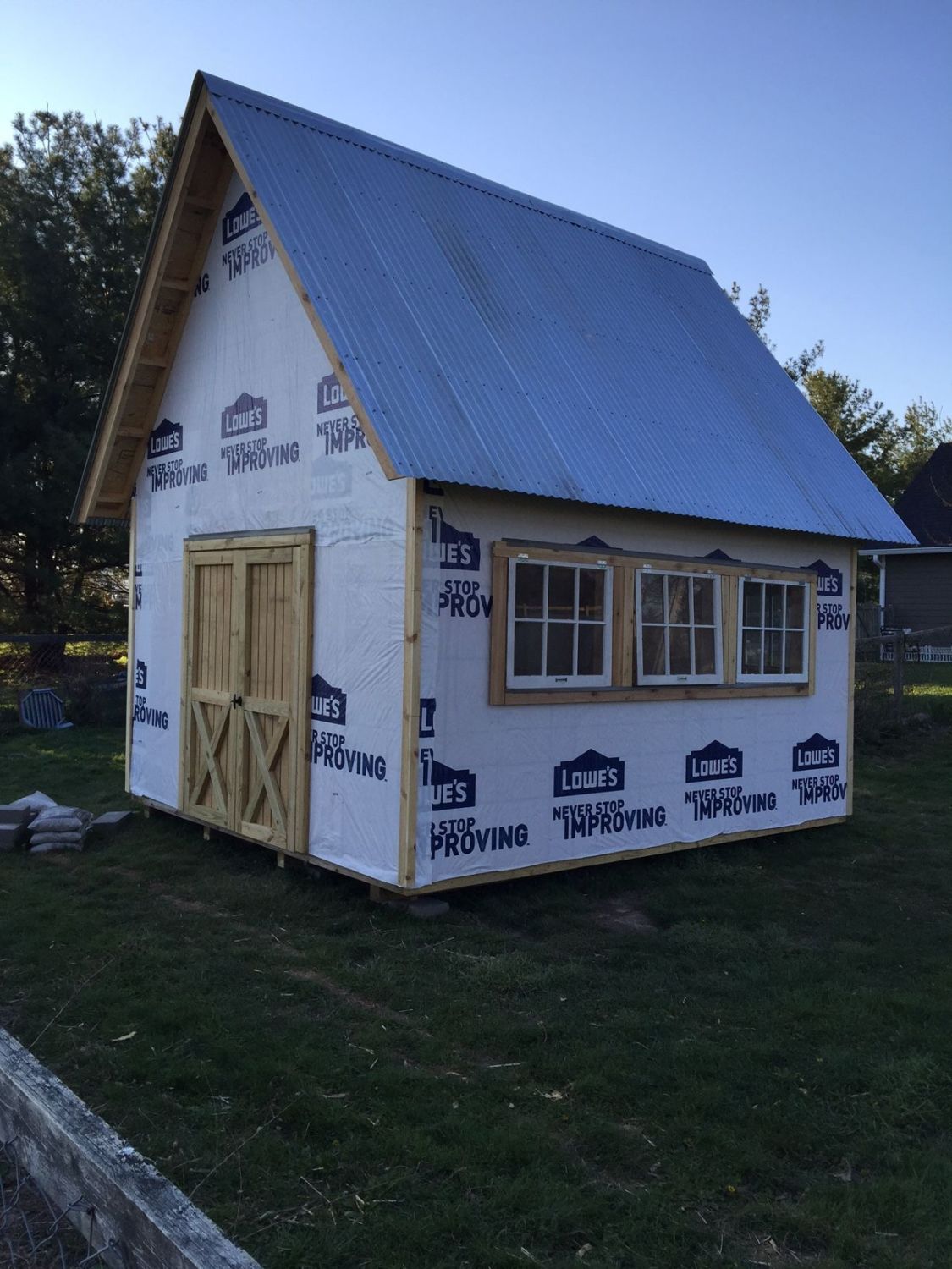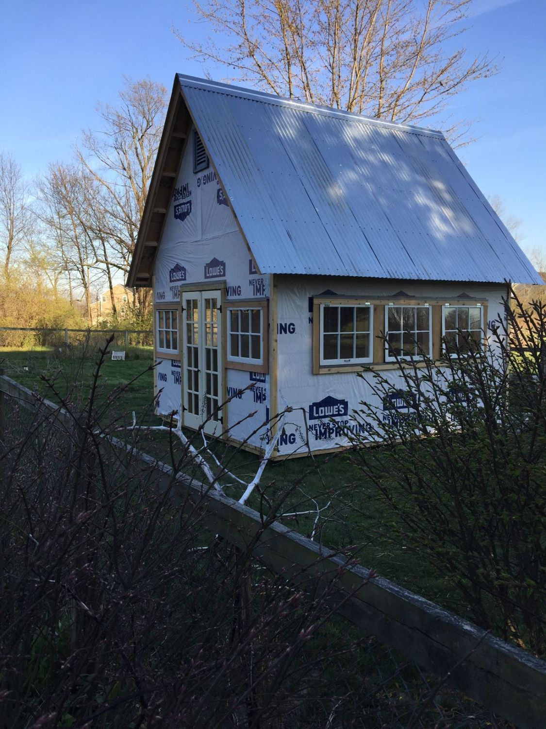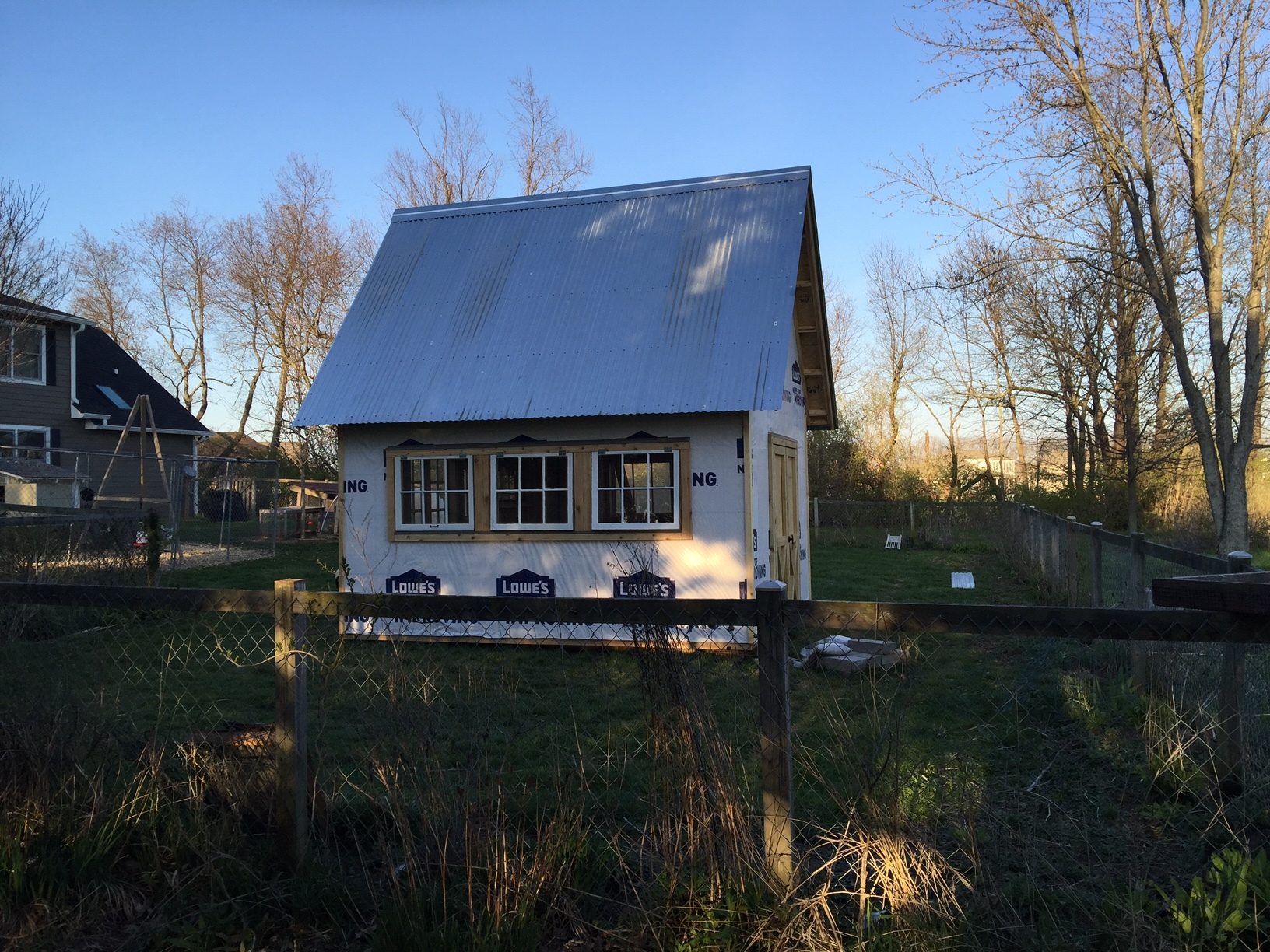 Well, he did it! Got the roof on, ridge cap and all. I definitely heard it more than a few times, over the last two weeks, what trouble it was to do that roof pitch.