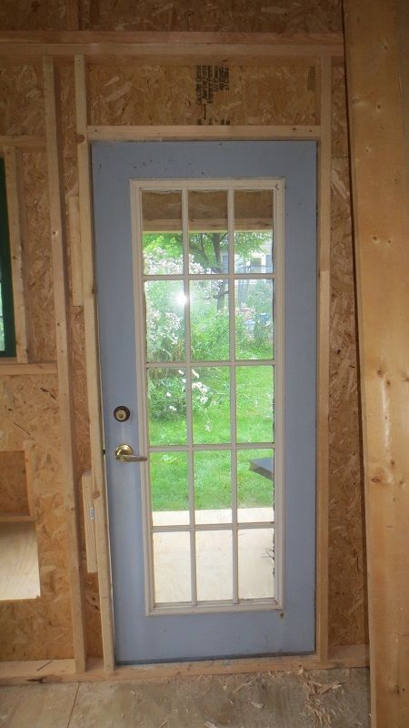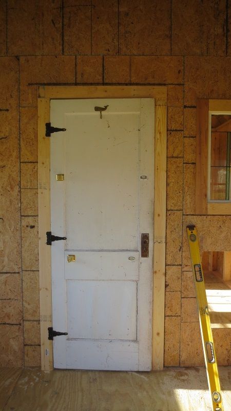 But since it was raining today, he worked inside the shed, and swapped out the interior door for me. Here is how it looked with the door I didn't like, and the funny framing job the man did. (He made one side of the doorway smaller so he could use plywood for the door stop.)
