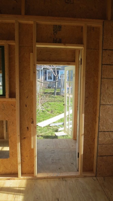 You can see that there is much less space between the two studs to the left of the door now. And the opening is taller at the top, too. All that is left is to attach proper door stops.