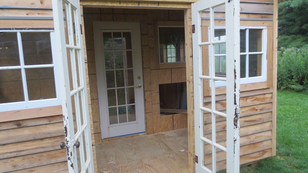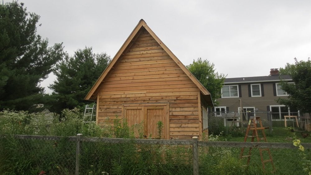 OK, so another long weekend, and some more progress on the shed. Except that it started to rain today, and is not expected to let up for the whole next week. It turned out we had enough of the reclaimed wood to do all the sides and most of the back. There is just the gable above the back doors that is going to not match for a while, since we will be putting new cedar there. When the rain stops, I guess. And after my husband kills the hornets nests that are up there under the eaves...