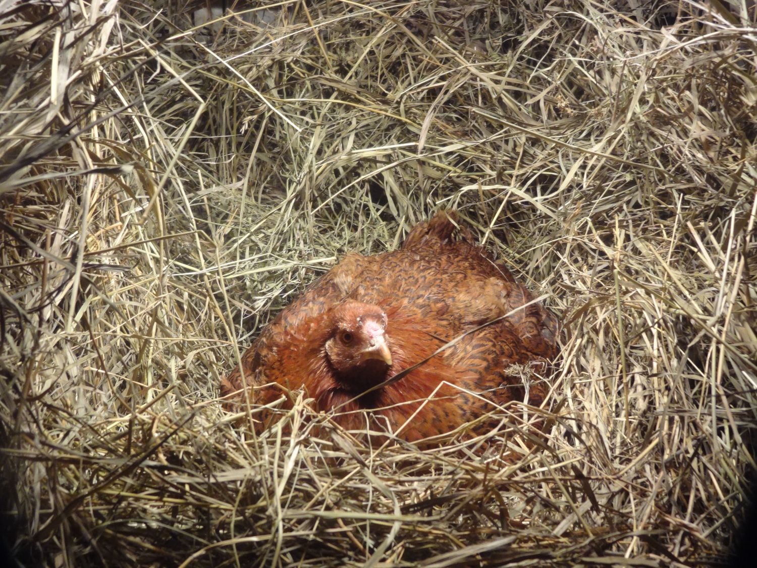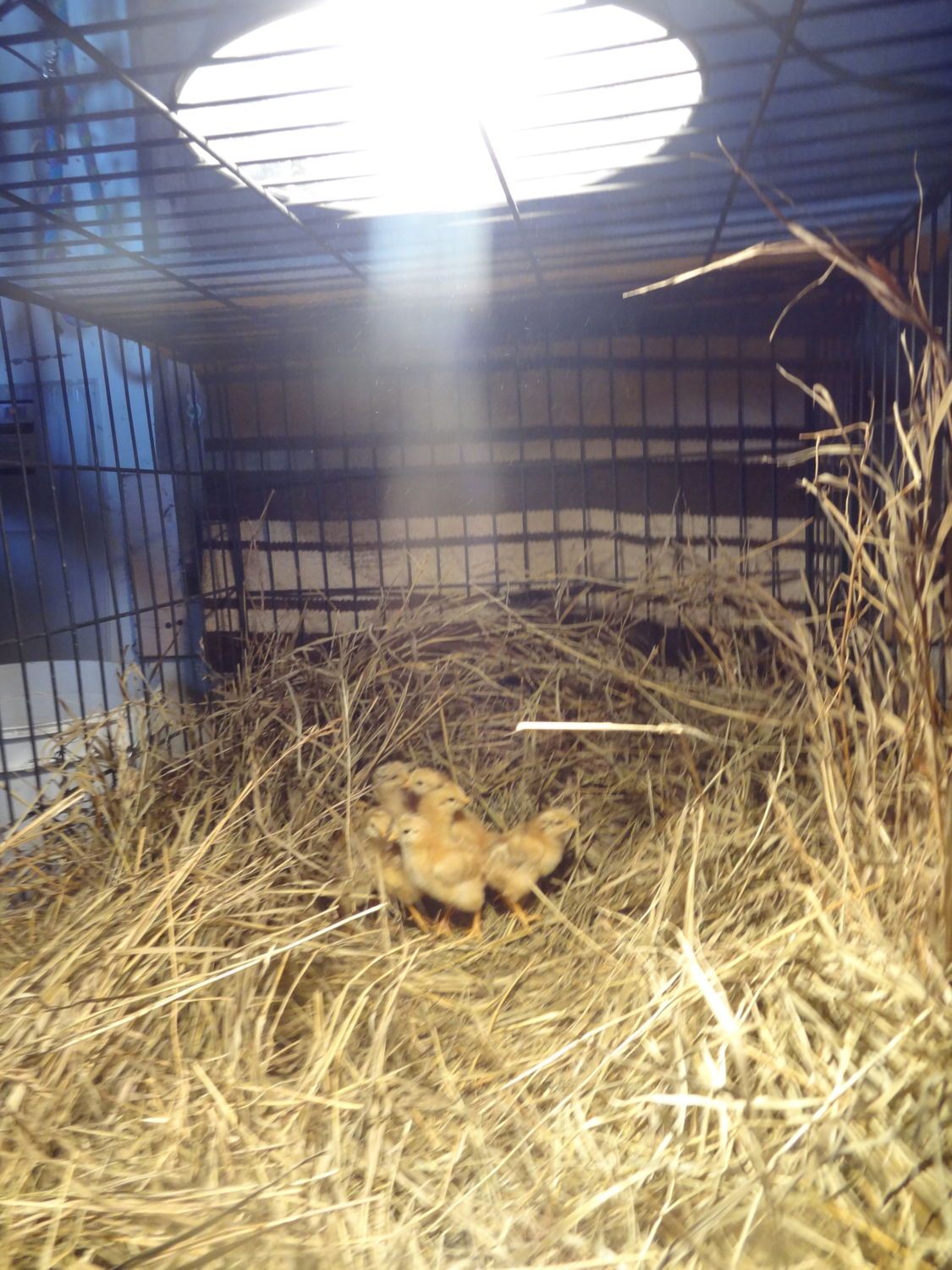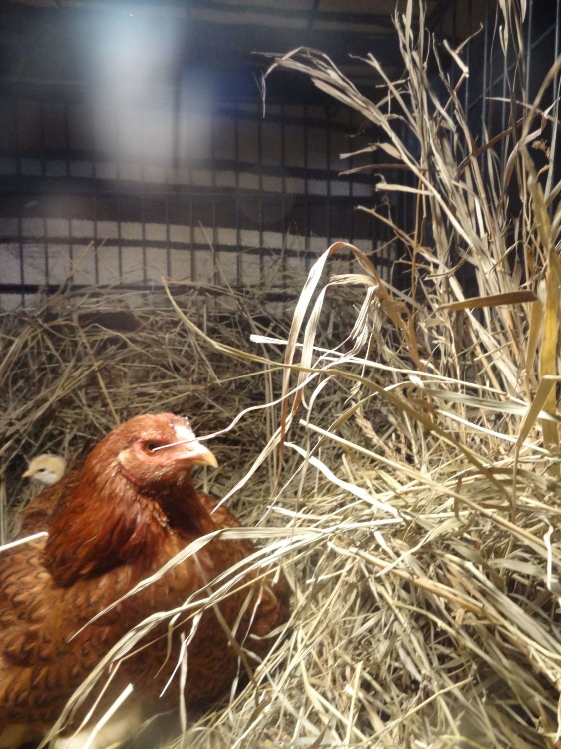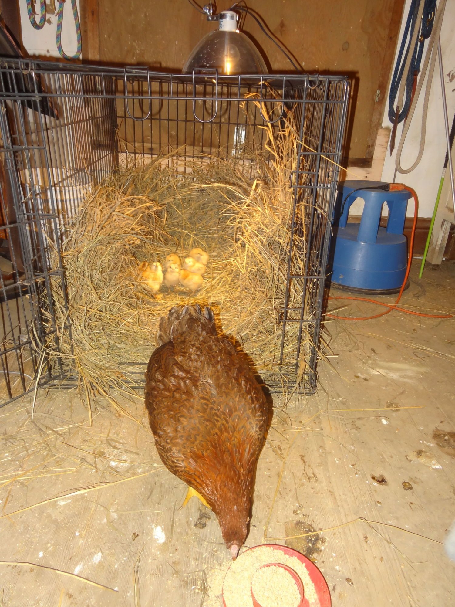 Here she is in a cage with the chicks and eggs not hatched under her.