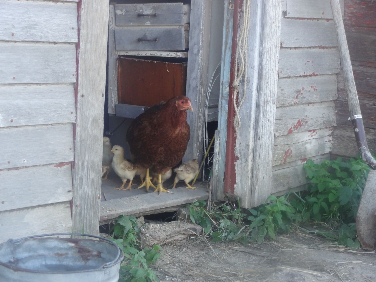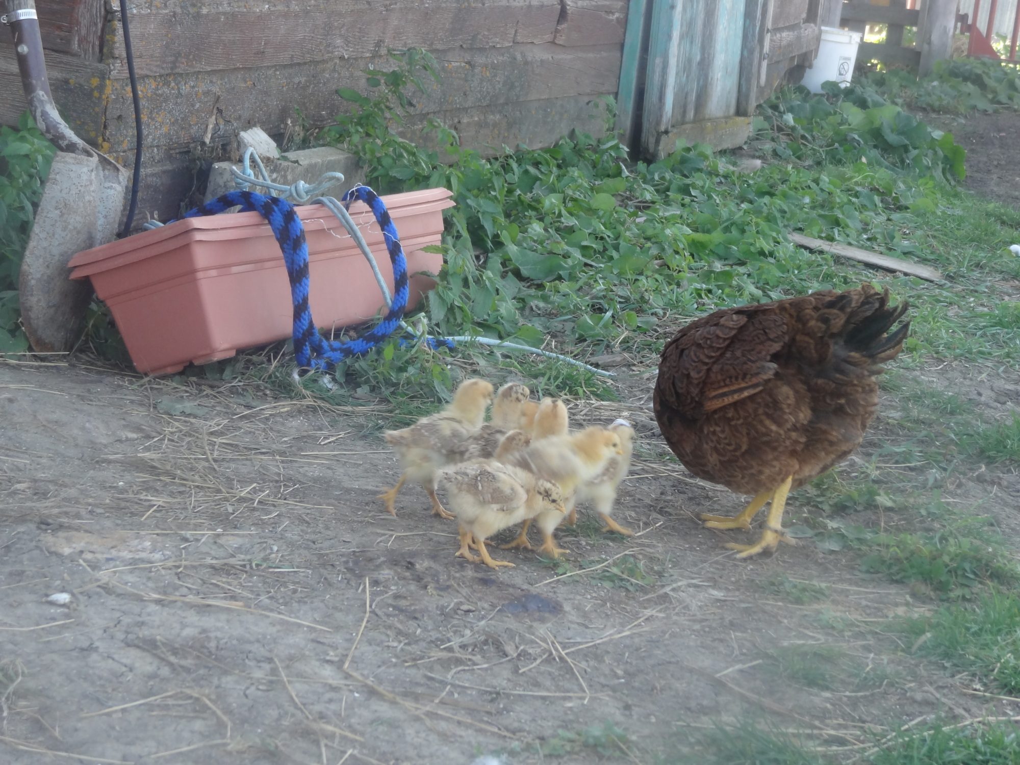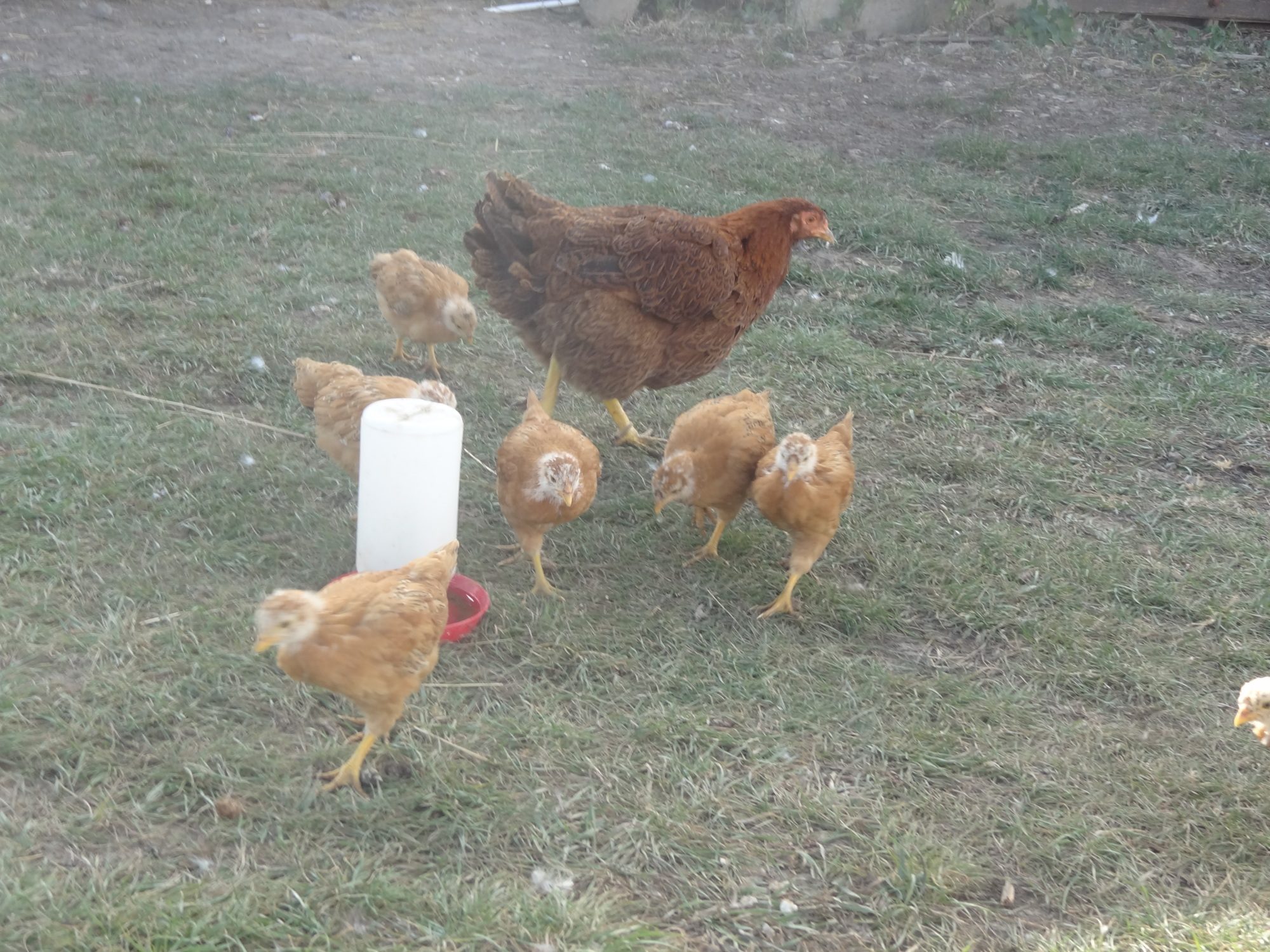I thought one of my partridge chanteclers, Delilah, was killed by a coon or hawk, but instead in September I heard peeping under a wheelbarrow!! Ralph has heirs!