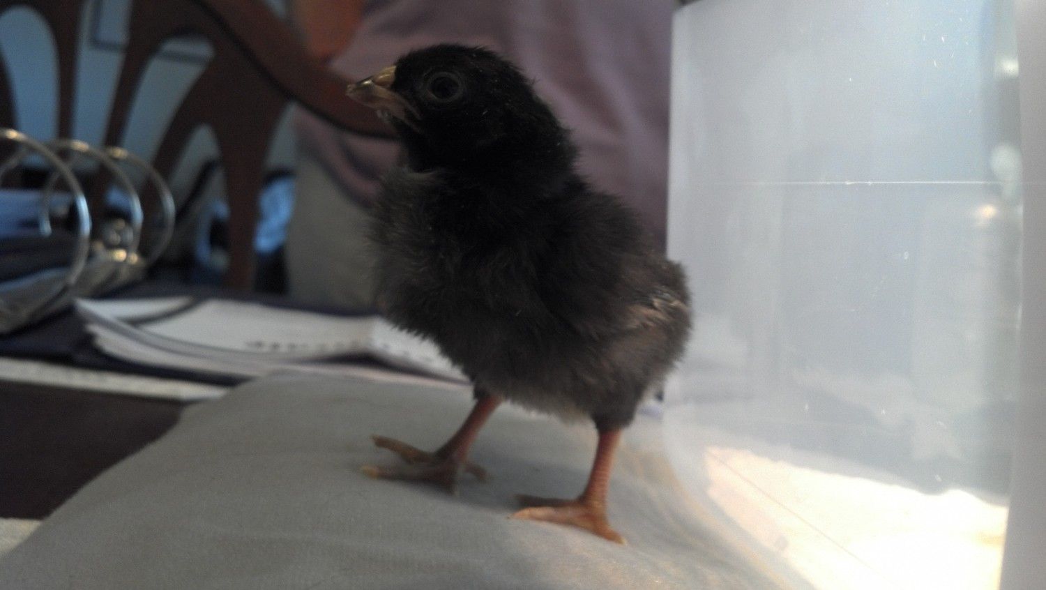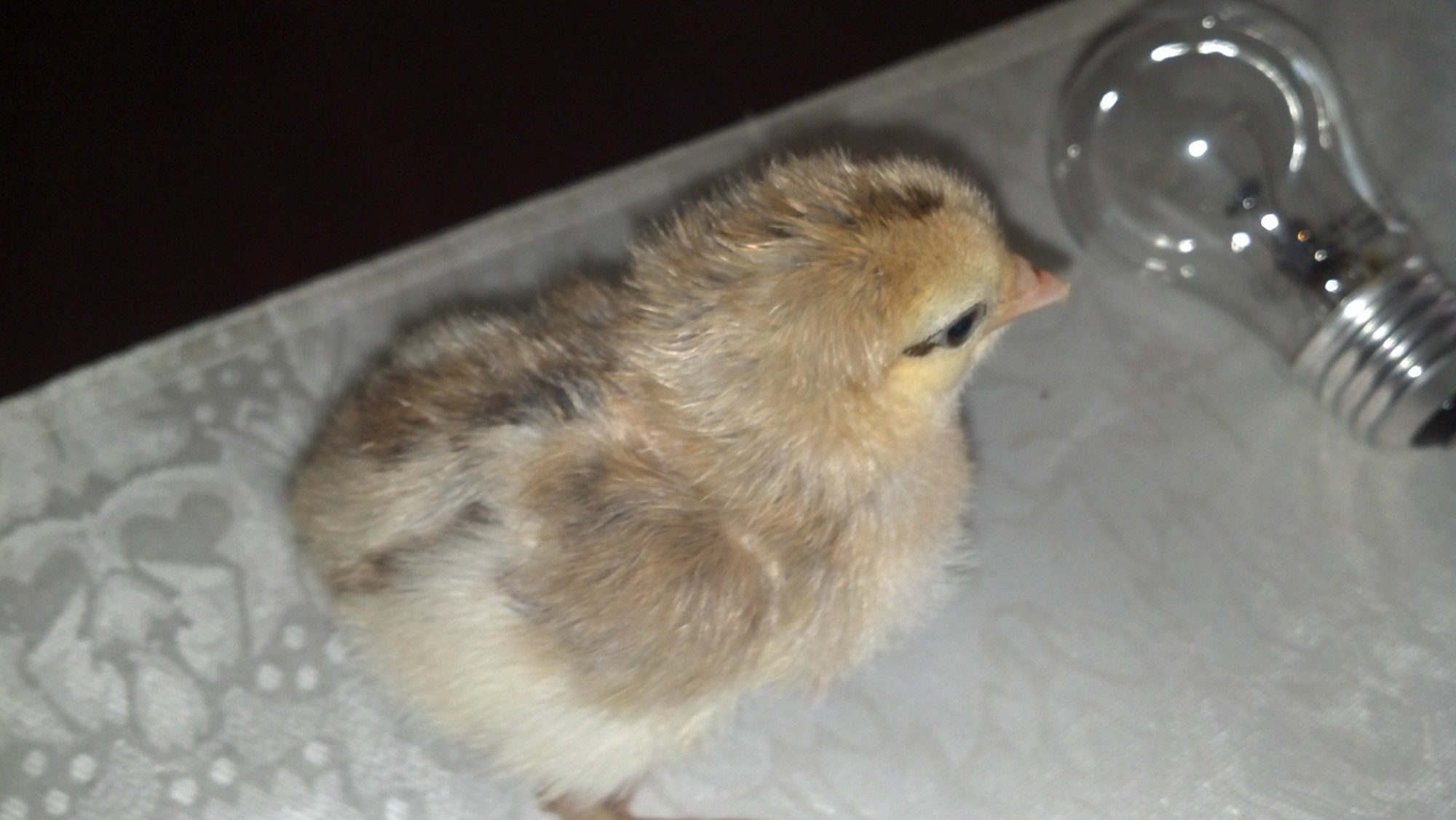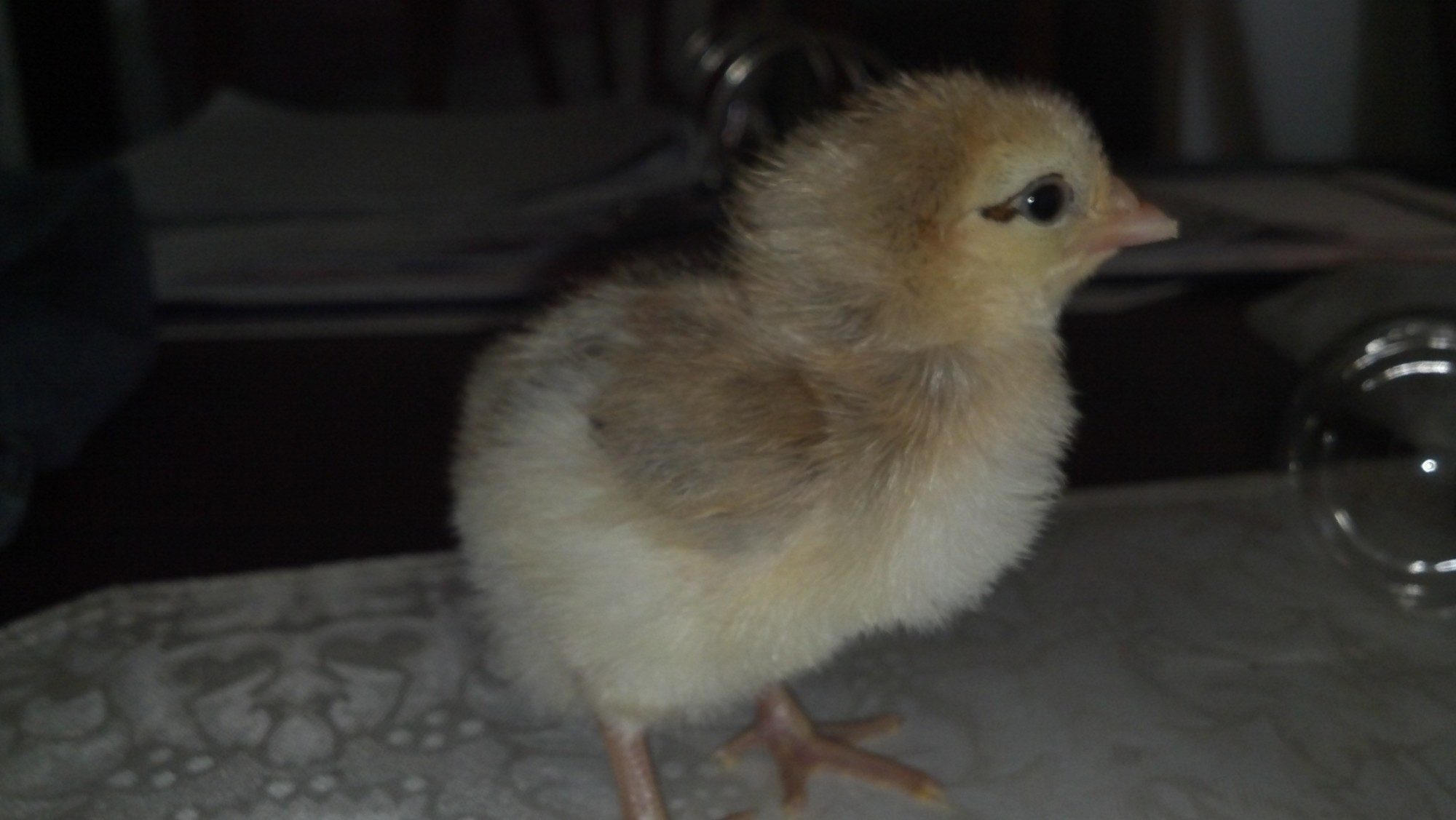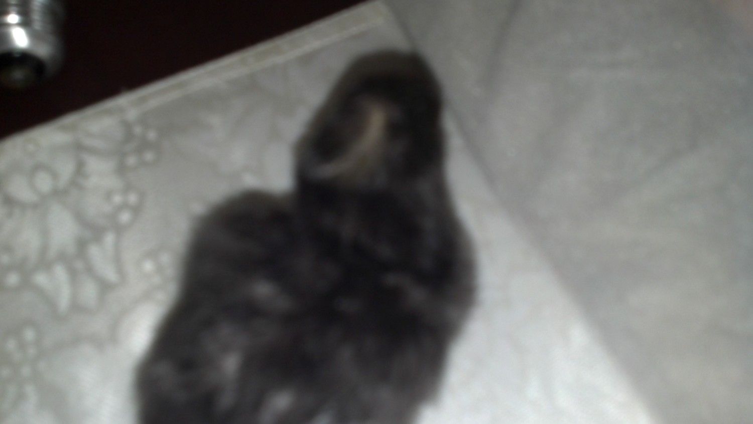 Onyx hard to take a pic of a darker chick but she has a round white spot on head and darker legs (no feathers).