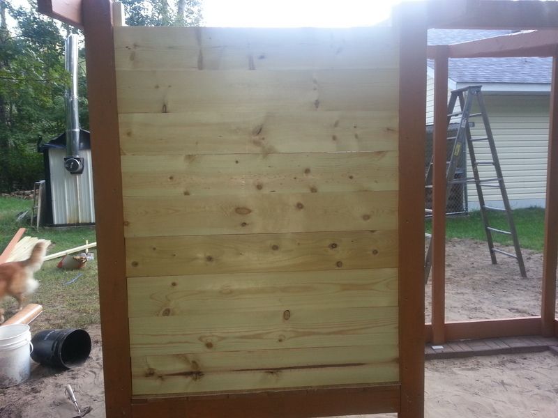 Bought some caulk and put it between each board before I nailed them down, so that should seal up the walls pretty good. Framed where the nest box will go and a window above it. And got most of the hardware cloth up. We let our 3 week old chicks check out he run, they were having a blast!