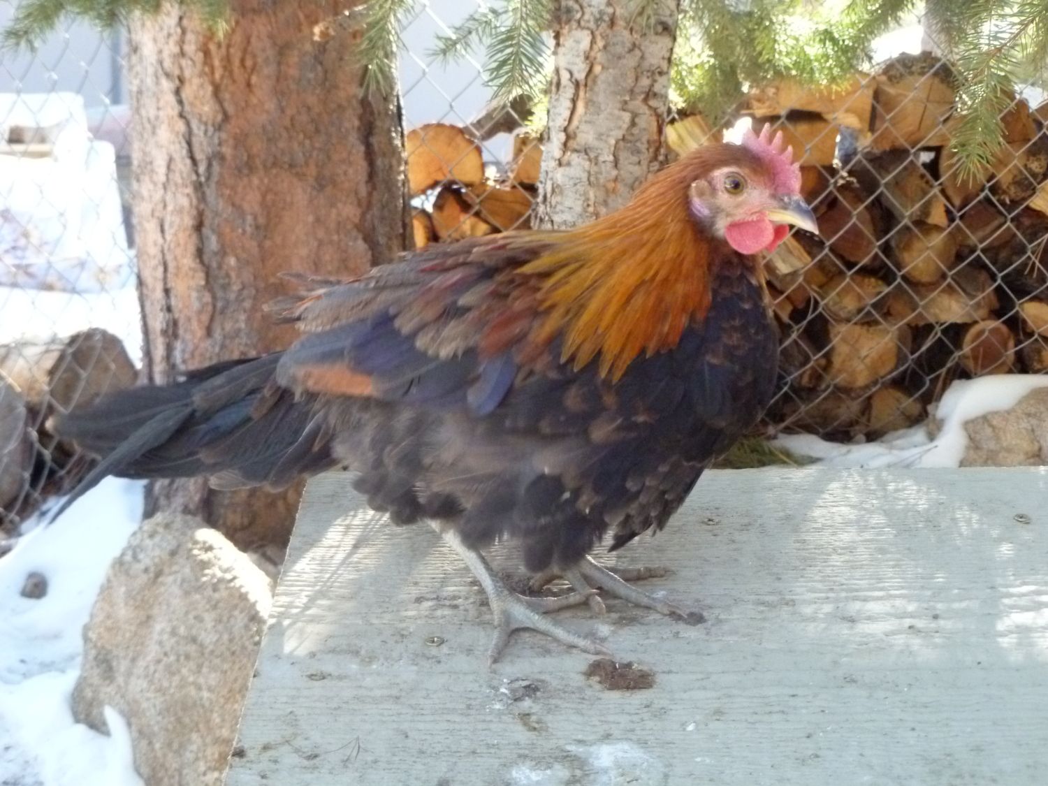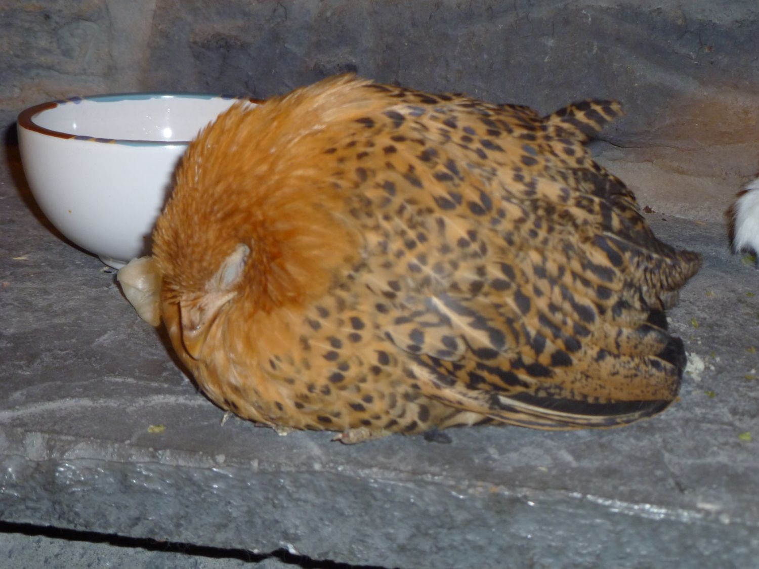 This first baby is not feeling well....I had a couple of my birds tested at CSU, and found that my flock has M. Synoviae...waiting for my Tylan to come, but that is another story. This is Aspen, and she is the smallest of the group. When she was little, she had circles around her eyes. She just finished eating and drinking, and with a full crop, she is taking a nap on the warm hearth.