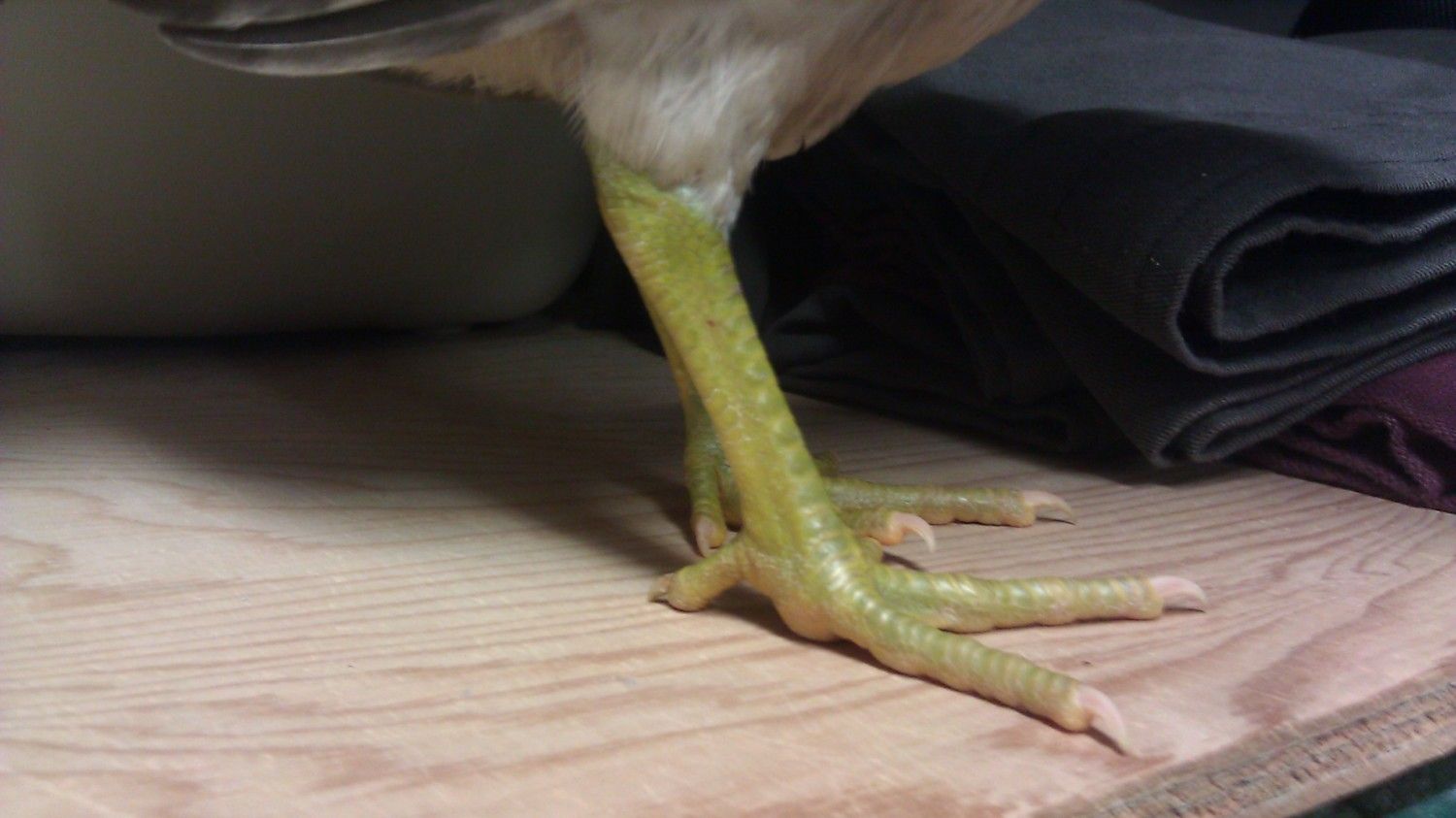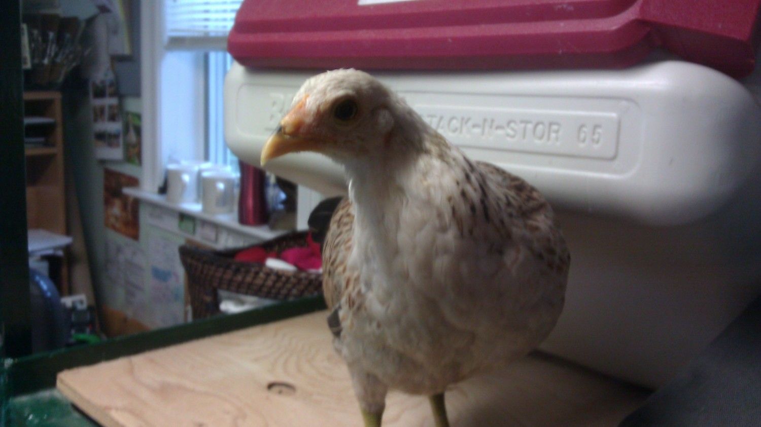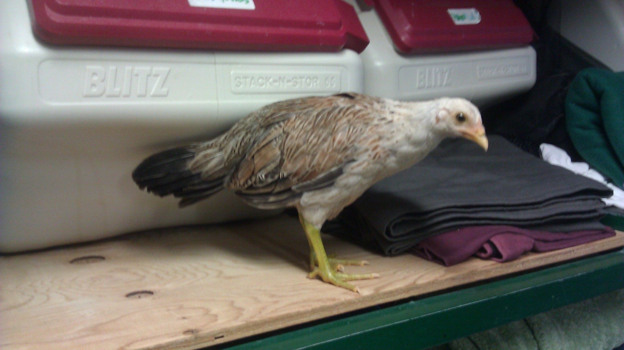 So this cutie was abandoned and brought to the wildlife rehab center I work at. No idea how old she is or what breed, but pretty sure she's a pullet. Any ideas as to what breed she could be? I'm thinking she's probably just a mutt, but boy are her legs green!
