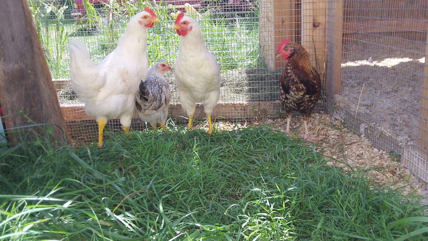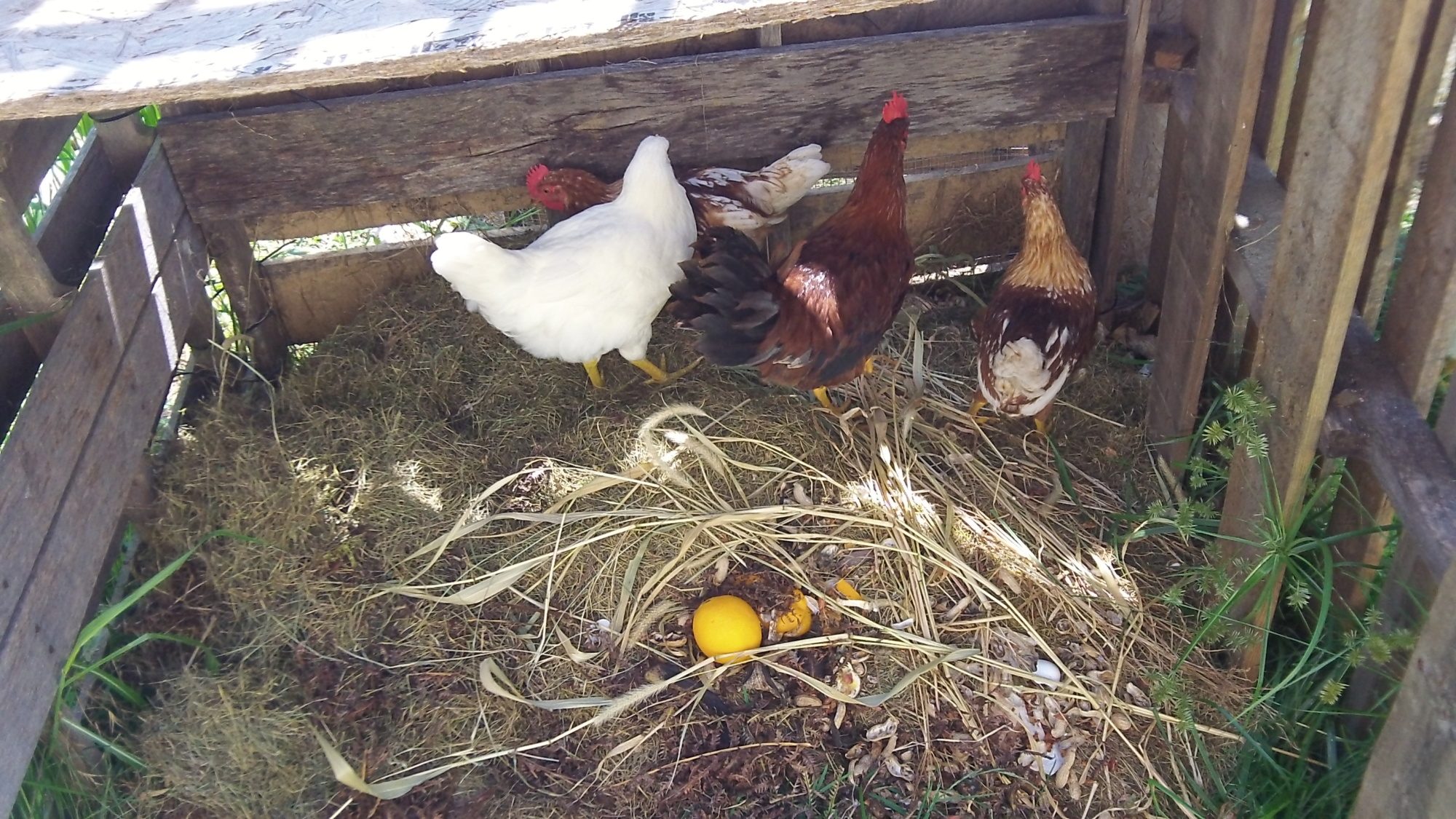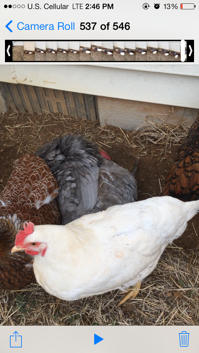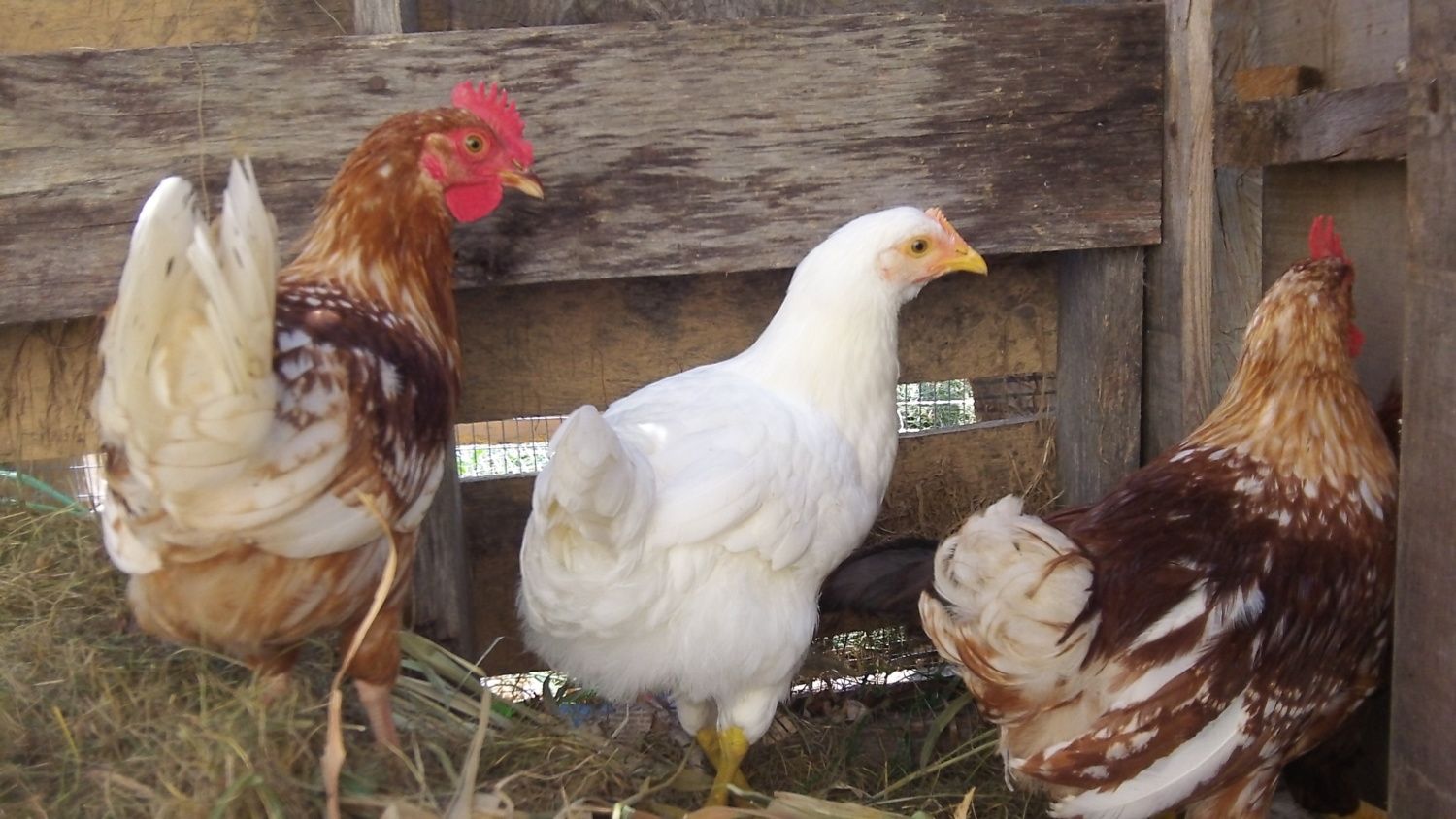 The white chicken in the last picture is my hen named bunny. The white roosters in the middle picture were her identical brothers. I got her from a local man who bred chickens and hatched them as a teaching opportunity for his children. I bought her under the premise that she and her brothers were RIRs. As chicks they were all yellow. It is clear now that she is not a rhode island red. The other breeds the man had were RIRs, cornish hens, araucaunas and barred rocks. She is now about a year old and is a bit smaller than my wyandottes but larger than my EE bantam. She has a red single comb that is on the short side and yellow legs and beak. Her eggs are large - once she layed one only slightly smaller than a baseball! They are the color of chocolate milk with really dark brown spots on them. Below is a more current picture.