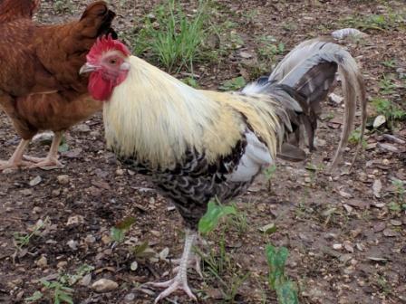 He is the only rooster we have. We got six RIRs, four White Rocks and two Americaunas, all around 3-4 months old. This cutie came along with us as we requested "a rooster". I think we should have been a little more specific, but he's easy on the eye, so I'm not overly worried about it.