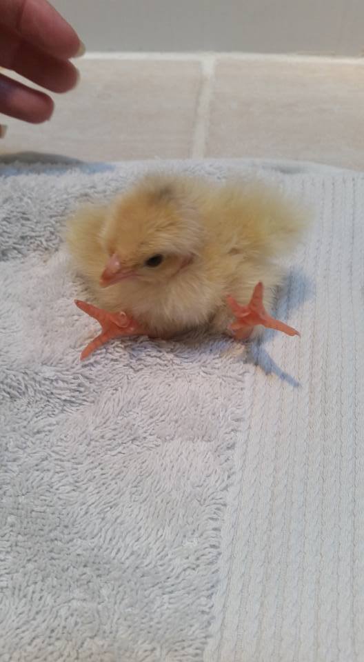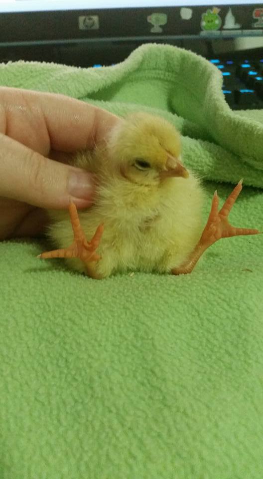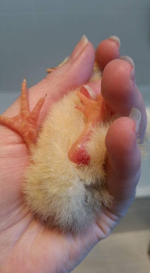 I hatched this little cutie yesterday and her legs were just fine, today they are upright and the knee joint is all red and swollen. What happened to her for this to happen? Is there anything I can do to help? I feel like she's in pain.