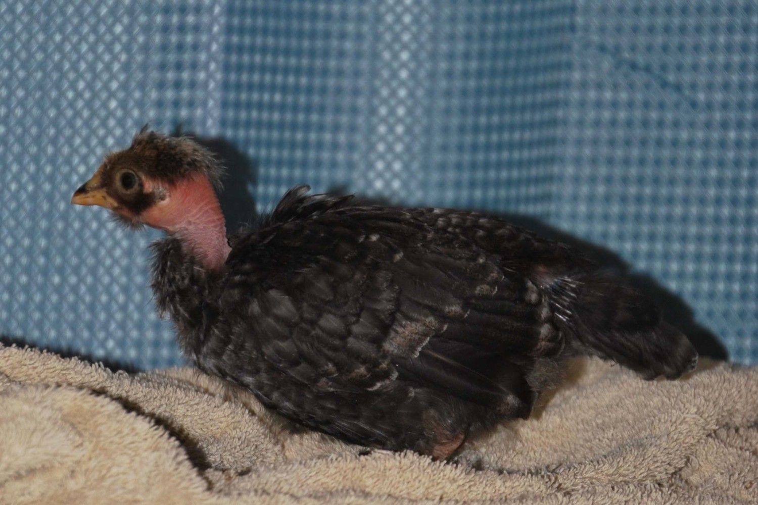 Pics of the girls at 3 weeks today She is starting to grow a top knot, she is by far the lightest mostly white w/ some black feathers. She has light Fm also. This is a barred girl w/ a top knot also This girl I am only about 50% on but really hoping. This girls color/pattern is very interesting, doesn't show in the pics as nice as it really is.