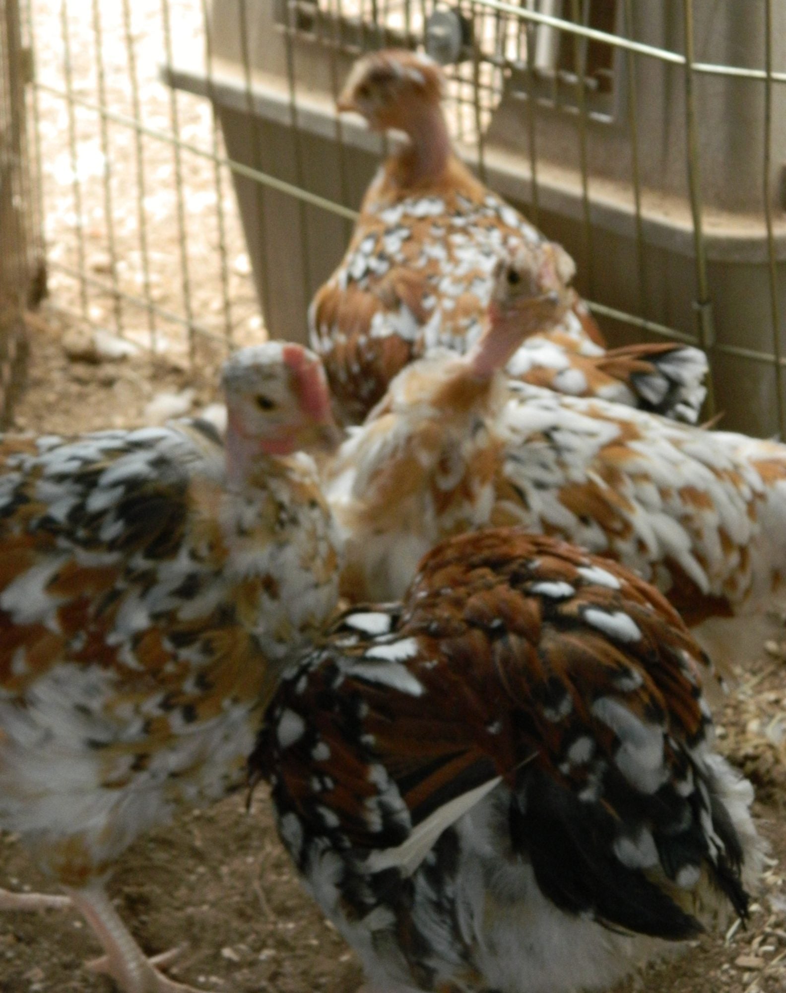 And the chicks shown in these new pics are the grand-kids from the original NN / mottled rooster. Only four out of seven were spotted - I sold the solid colored ones. Dad to these chicks could be several roosters, but I believe they are all sired by my Sussex-bred roosters as those roos have pink legs and so do these chicks.
