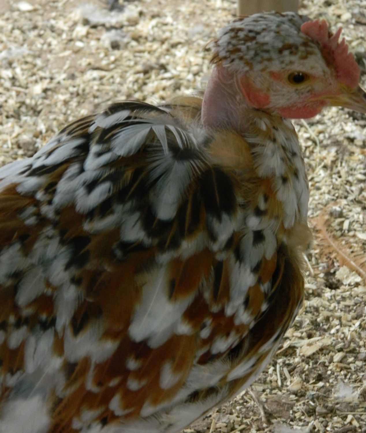 Here is the original breeding pen - the rooster had amazing amounts of white spotting that I loved, but he was thin and "weedy" and desperately needed more bulk and substance: