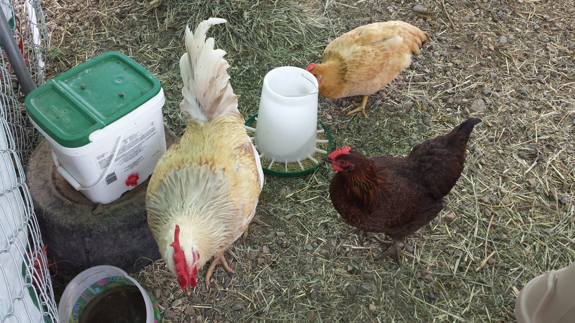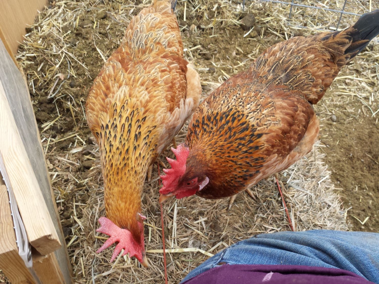 The LR chicks were hatched around the first of March. The pullets are just starting to lay in the last week. This first pic shows one of the roosters next to a partridge rock hen who is the largest of my LF hens (heavier than the buff orpingtons).