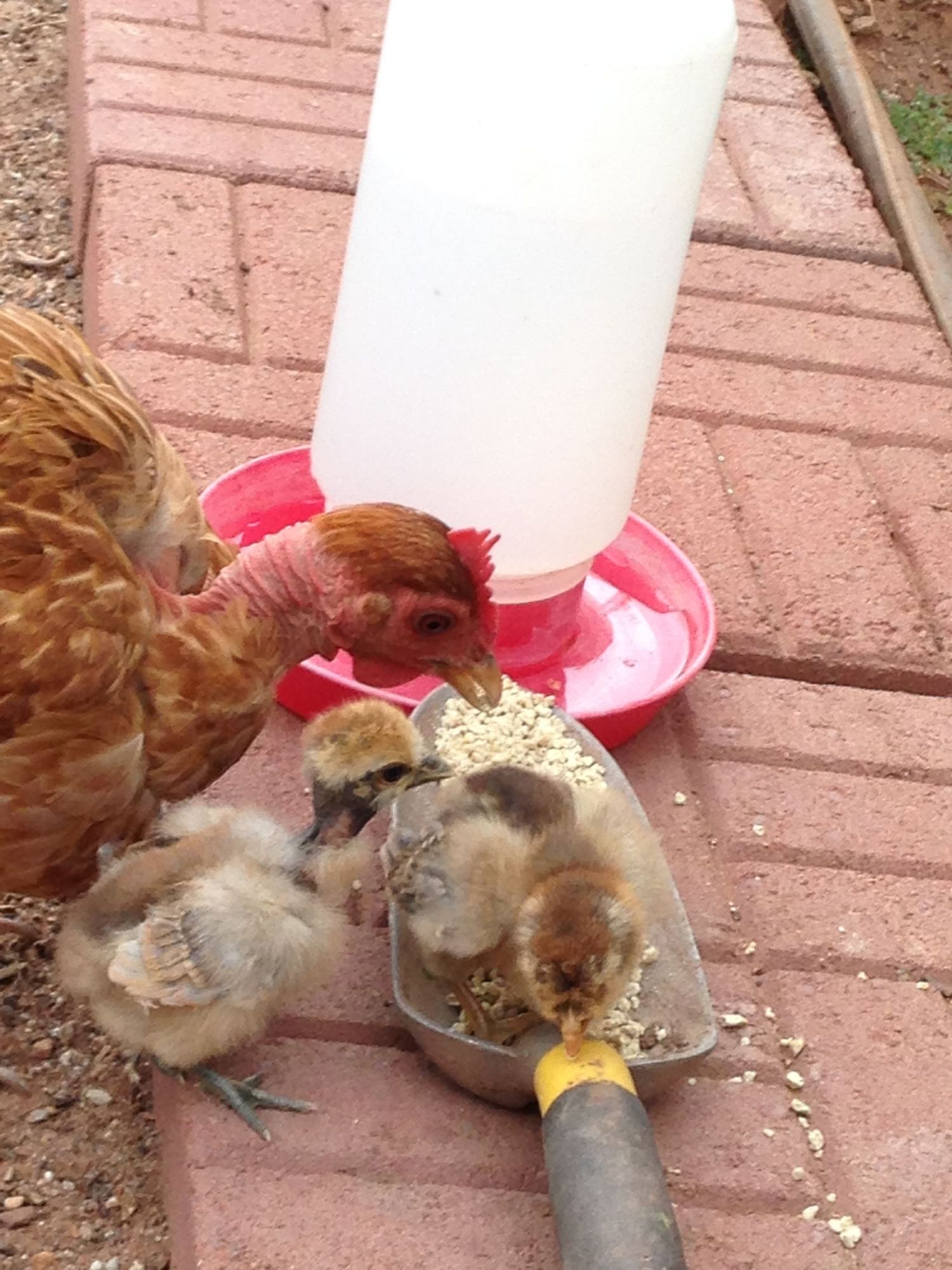I'm so excited!!!! The mostly NN eggs I put under my broody hen started hatching last night, and the first to emerge is a lovely buff colored NN chick. Momma Lily got off the nest very briefly last night when it was roughly 100 degrees out so she could gulp down quick meal, so I was able to snap a somewhat blurry photo of the hatching chick. And just because I finally got a photo of my (most of) my NN flock, here's a picture of them too: