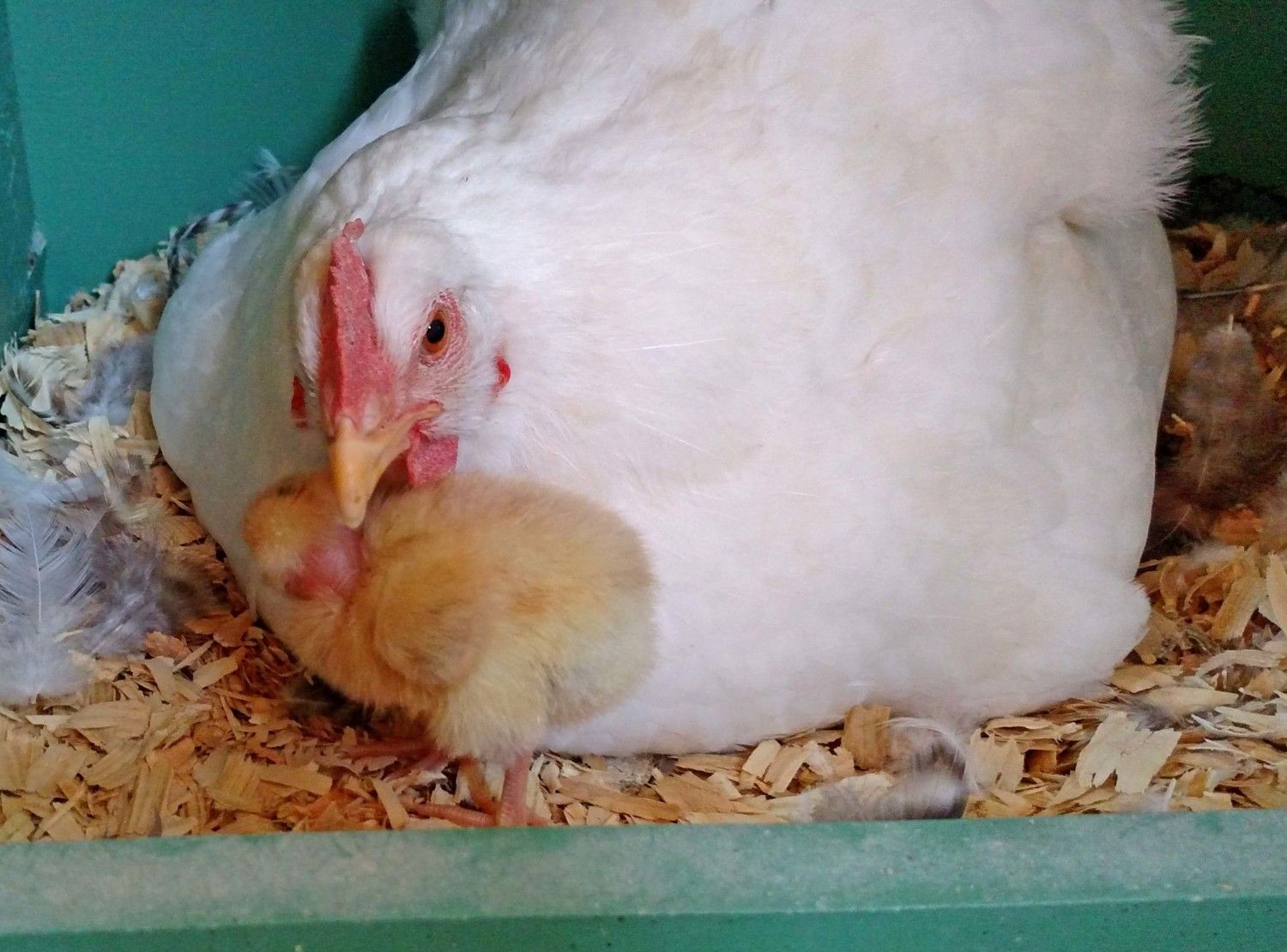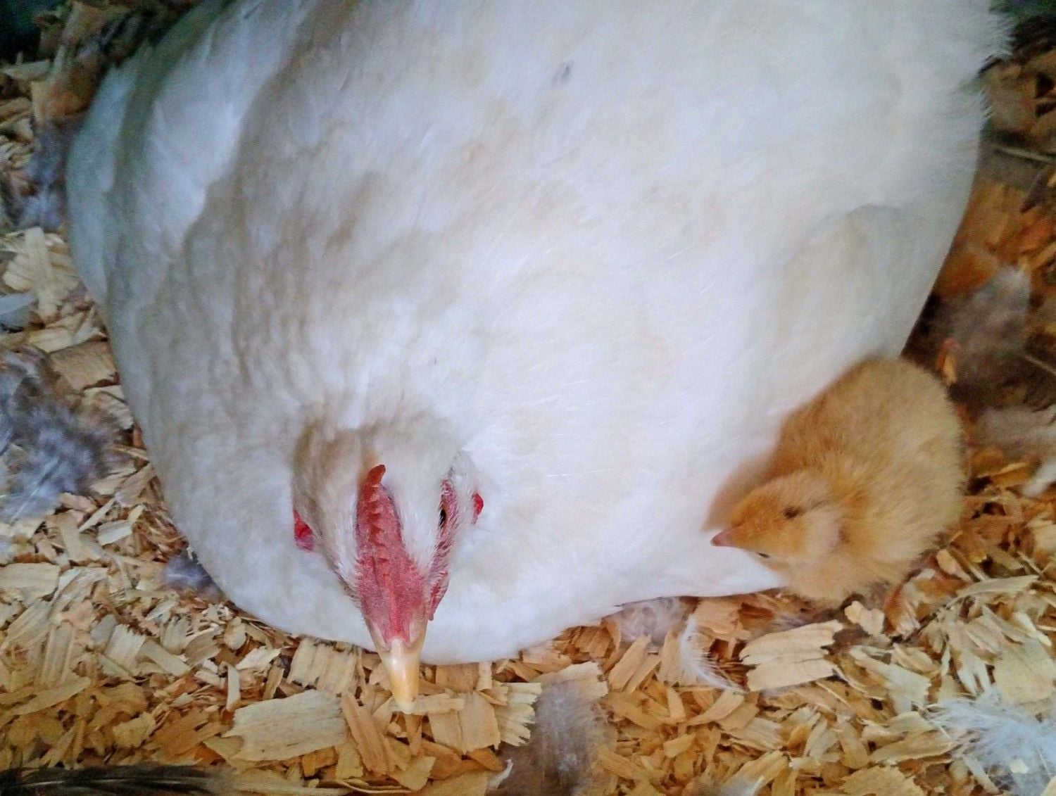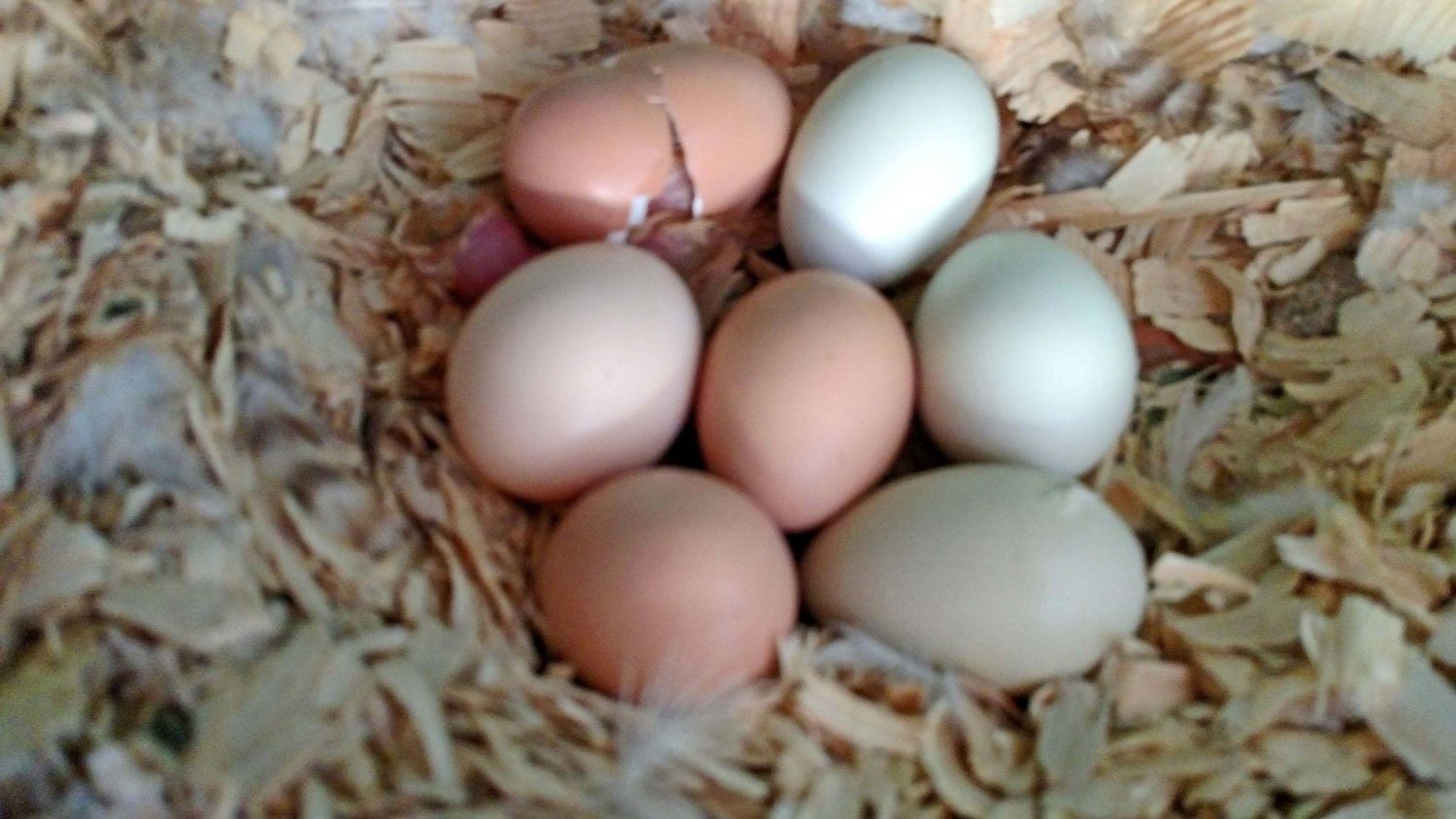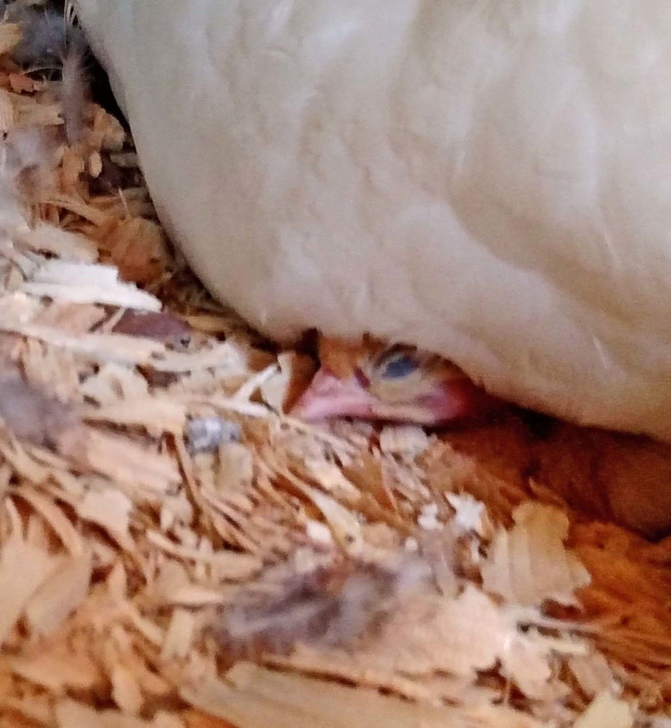 I'm so excited!!!! The mostly NN eggs I put under my broody hen started hatching last night, and the first to emerge is a lovely buff colored NN chick. Momma Lily got off the nest very briefly last night when it was roughly 100 degrees out so she could gulp down quick meal, so I was able to snap a somewhat blurry photo of the hatching chick.