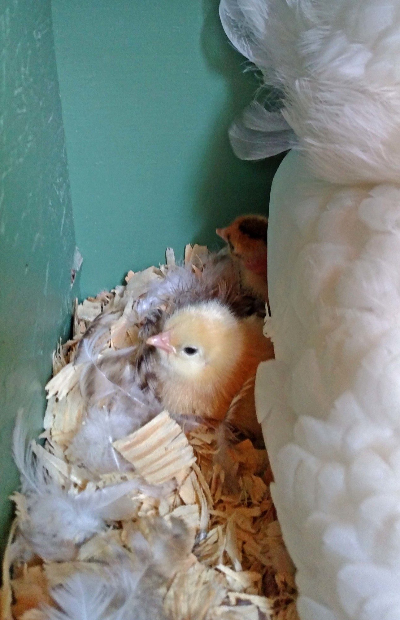 OKAY!!! Baby pictures!!! Hooray! She sat on seven eggs and so far I've seen five chicks at once. I'm waiting to see if the remaining two hatch also before moving her to a private pen.