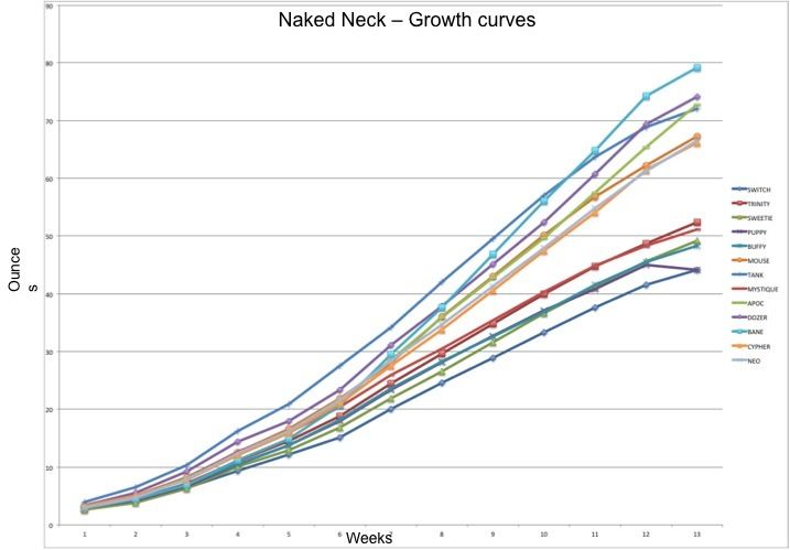 I just pulled up all the growth data from my first NN flock. At week 13, my flocks' average growth rate was only 11%, and the cockerel who was lowest on the pecking order had the slowest growth rate beginning at week 14. Truth be told, overall growth rates dropped for the entire flock around week 9 with occasional spikes up to around 20%, but usually stayed between 10% and 15%. Again...those are averages including both males and females. If you like I can do a quick calculation a little later today after I finish my chores to track the males exclusively. (I love Excel!)