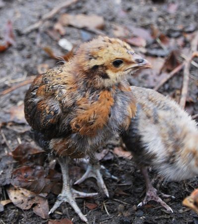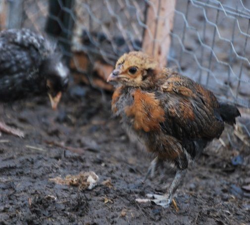 Apoc - who started out yellow downed - Kev says he is wheaten with mahogany. He's a pretty mix of black, deep mahogany, and orange. Switch is the pullet behind him - mostly black, with some subtle brown feather edging and reddish "hair":