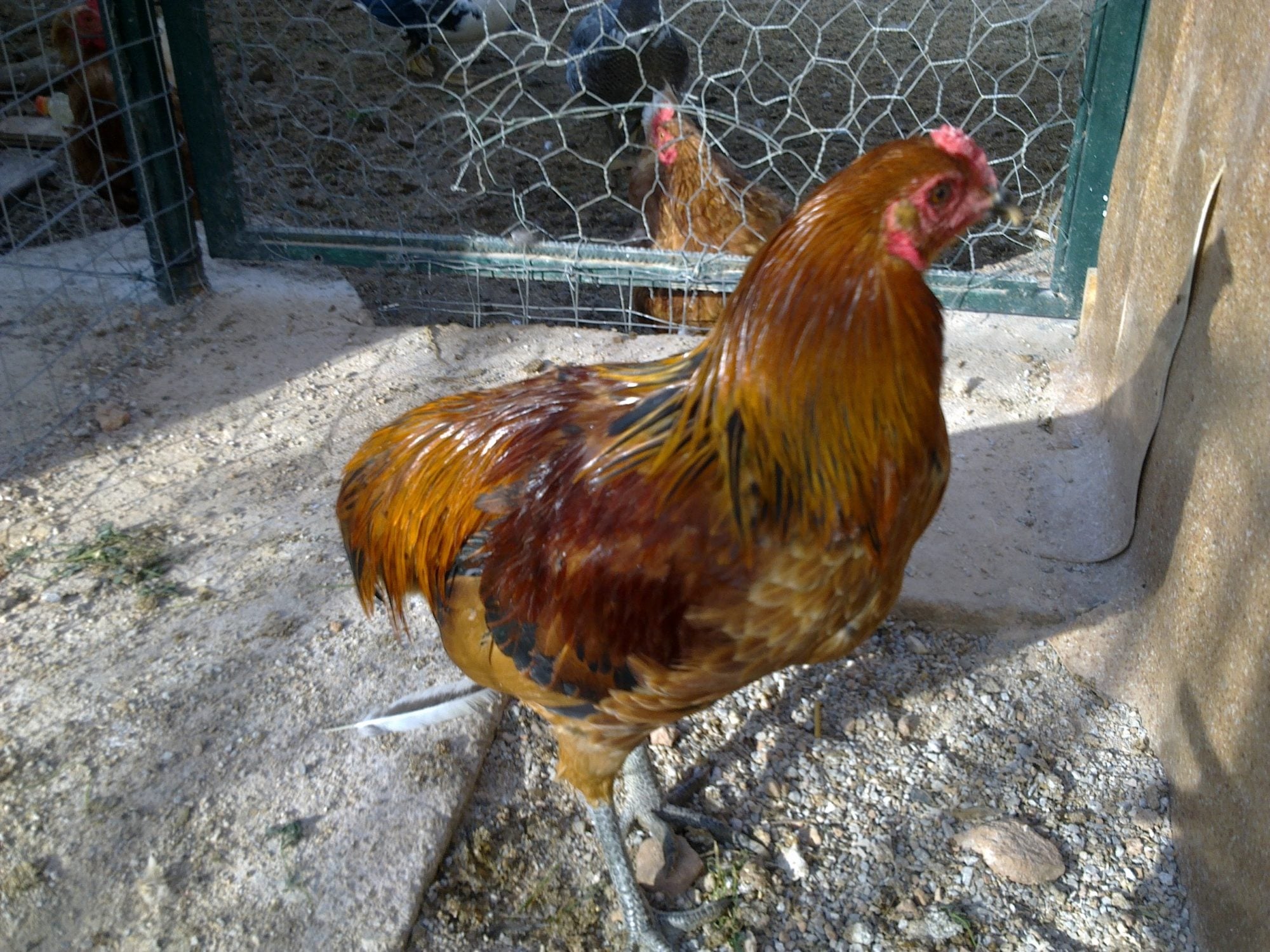 he is adorable! nice colouring too. sweet as chick. I don't see crooked toes when he was a chick. what happened to his toes?I have an Easter Egger cockerel that looks a lot like this but more red than golden! I've never been able to figure out if he's supposed to have a tail, but other chickens simply pecked out the feathers, or if he's tail-less. He's a super sweet mama's boy named "Chewy" (after Chewbacca, whom he looked like as a chick). I don't want to breed him because he's got crooked inner toes, but he's sort of become a family pet because he's always been so affectionate with all of us.