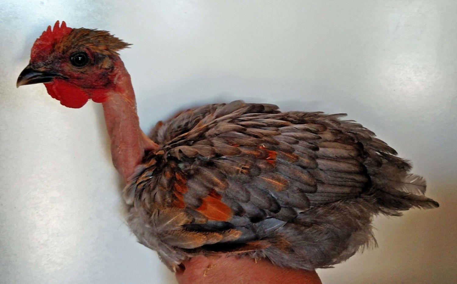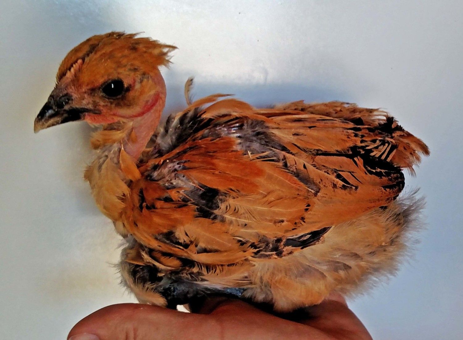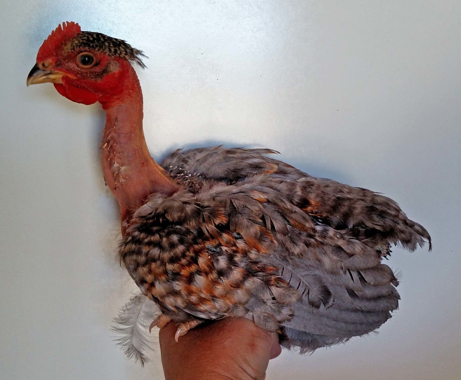 This little pullet is from the Cinnamon NN rooster out of my Blue Red NN hen. The second shot above show the coloring on her bowtie ( what littke she has) it also runs down into some of the breast feathers. Looks like his silver changed the red color of the mom to silver on this pullet. Blue Silver Birchen, would that be the right color to call it ? @Kev
