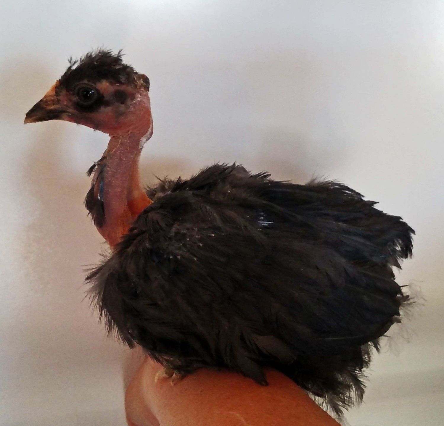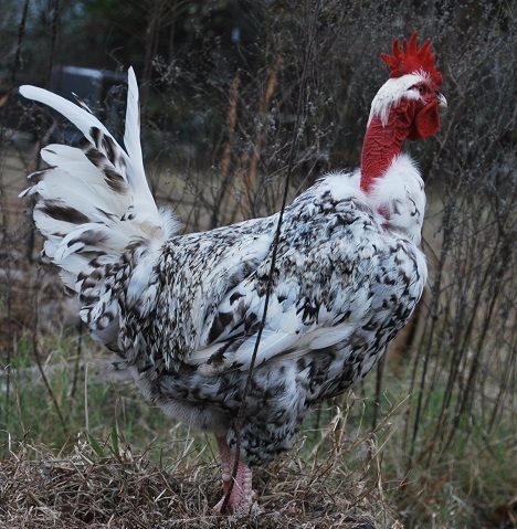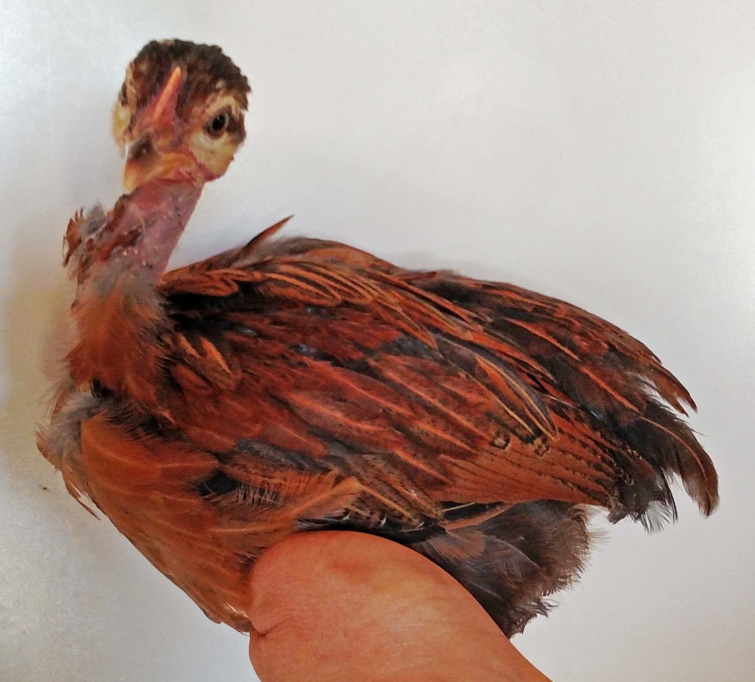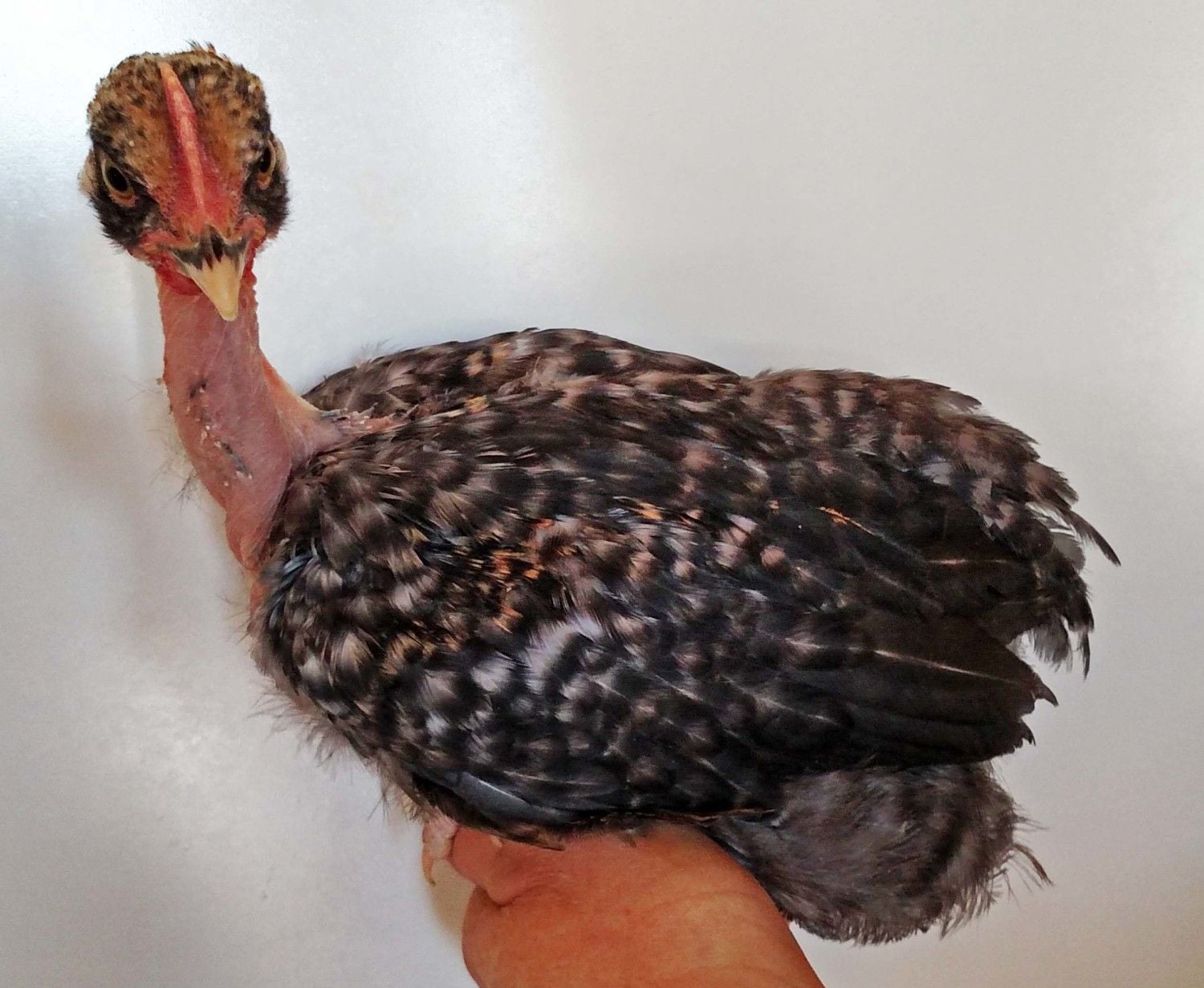 This little pullet is from the Cinnamon NN rooster out of my Blue Red NN hen. The second shot above show the coloring on her bowtie ( what littke she has) it also runs down into some of the breast feathers. Looks like his silver changed the red color of the mom to silver on this pullet. Blue Silver Birchen, would that be the right color to call it ? @Kev