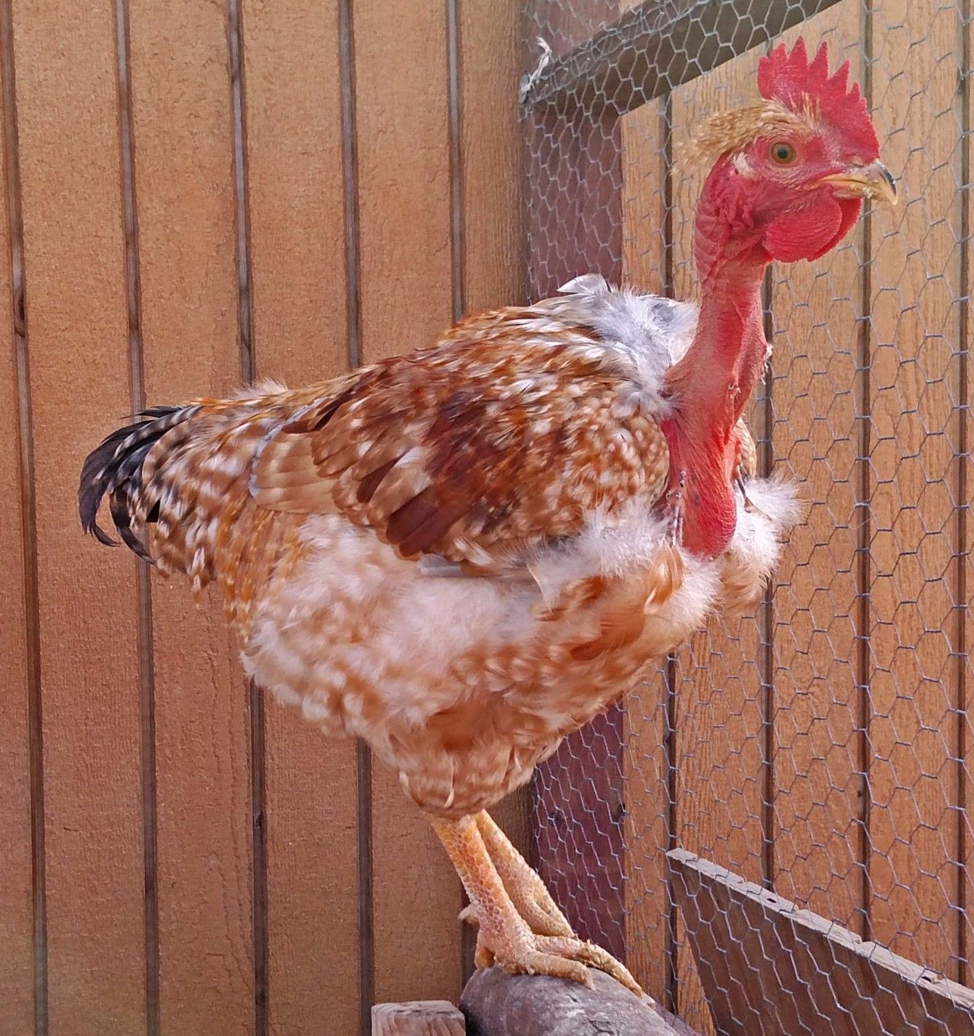 This one has been a surprise, I'm 99% certain he's a boy. His coloring is interesting. I'm not sure exactly what to call it. It's almost buff, but has some red tones and white specs, with the sporadic black feather. We'll see where he goes.