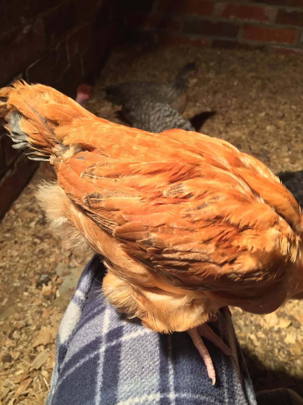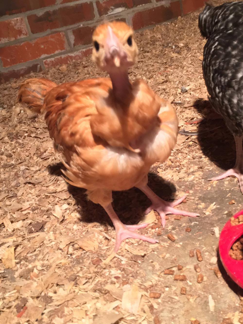 Here's an update on the reddish/buffish cockerel, his shank feathers are always so hard to spot. He seems to be getting white "speckles" on his feathers